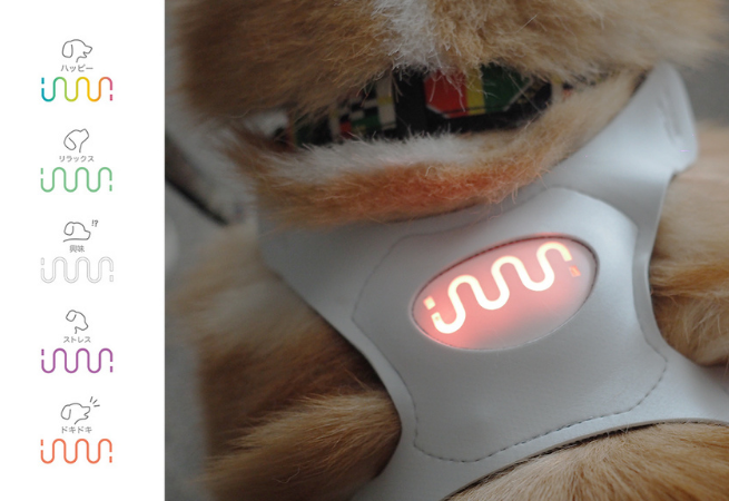 INUPATHY(イヌパシー)とは、心拍計測によって犬のキモチを解析する、犬用のウェアラブルデバイスです。装置を着けると、犬のキモチがハーネス付属のライトの色で表現されます。「リラックス(緑)」「興奮(オレンジ)」「ストレス(紫)」「興味津々(白)」「ハッピー(虹)」の表示パターンがあります。