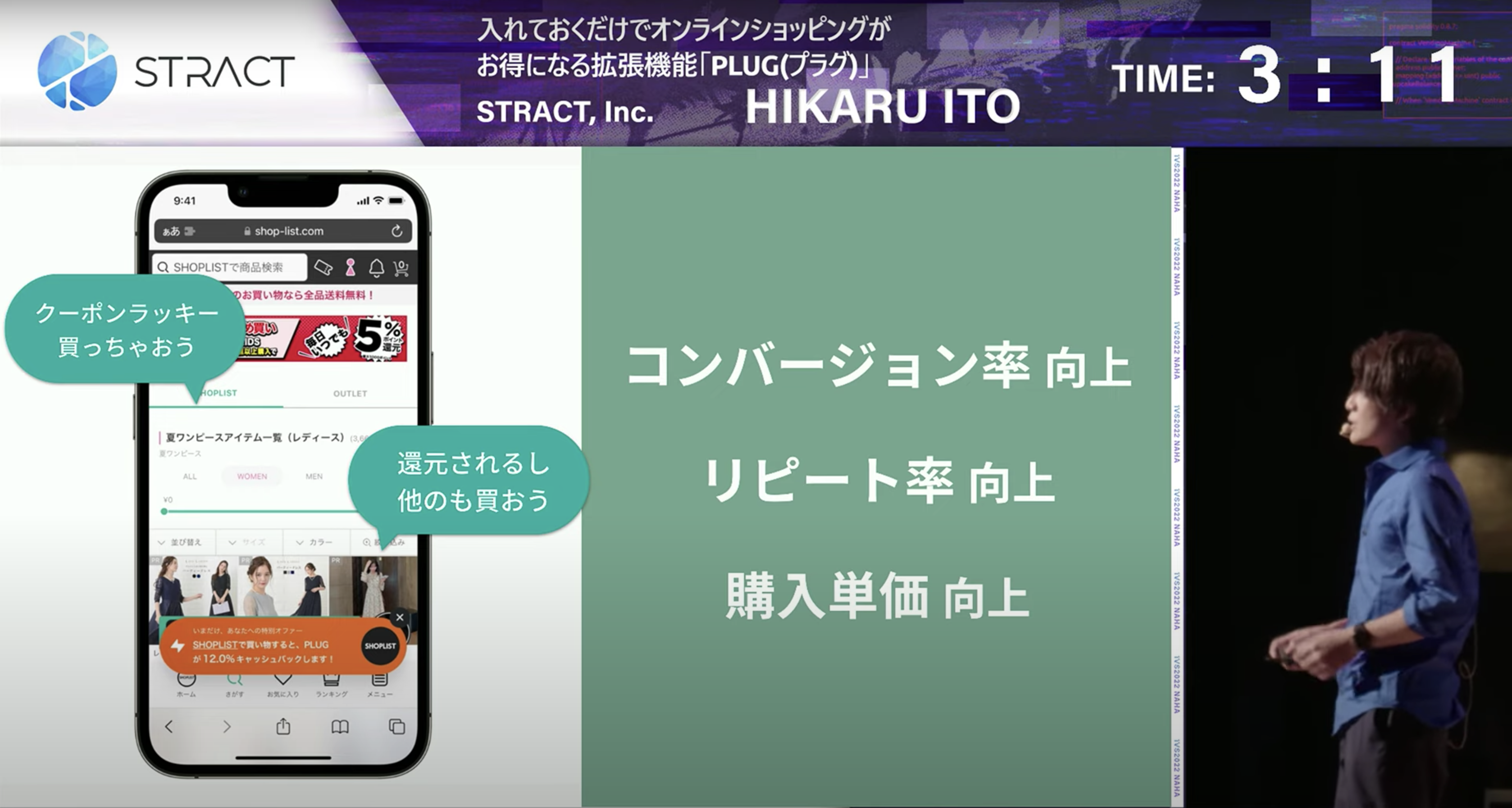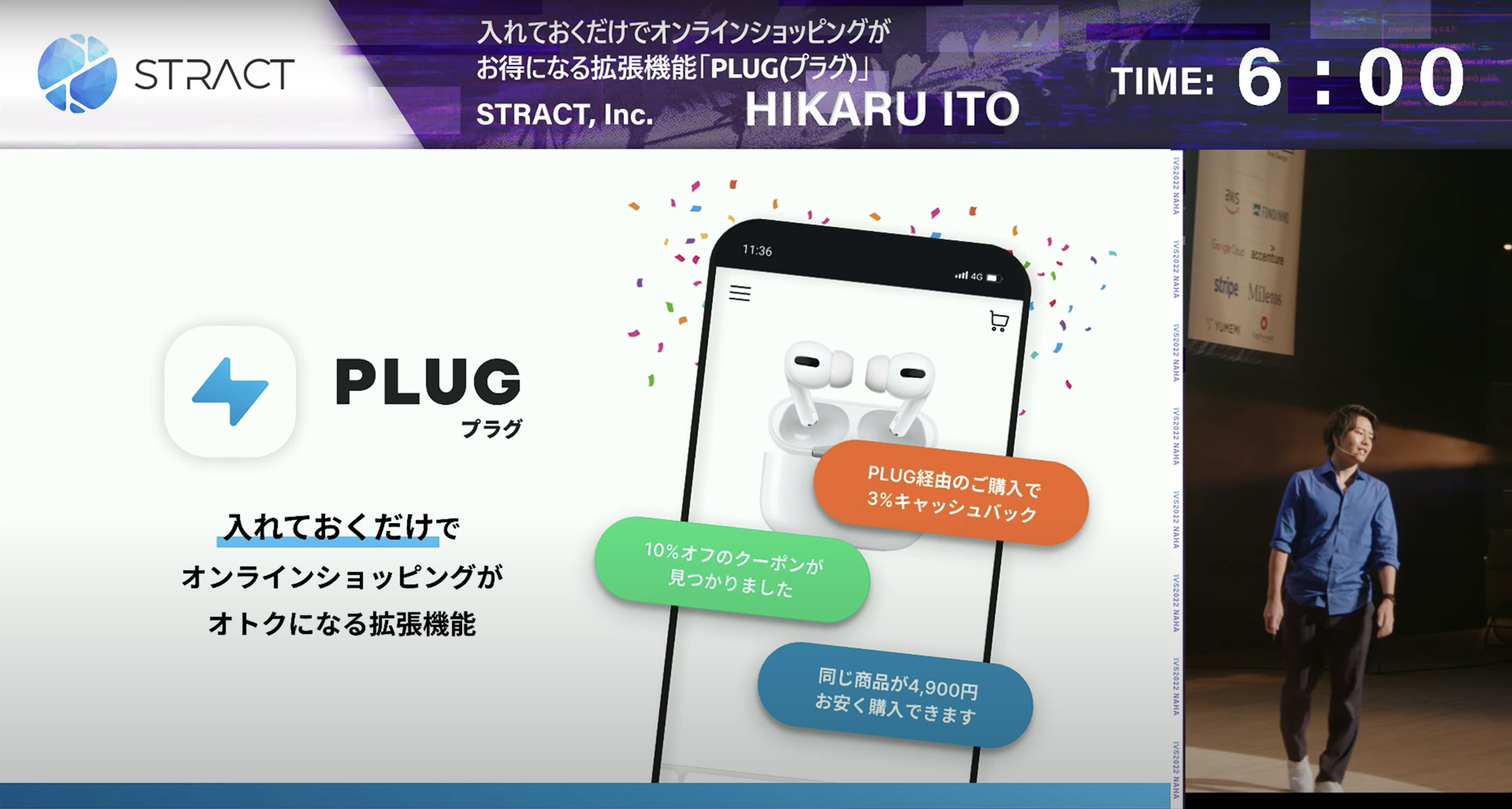 入れるだけでオンラインショッピングがお得になる拡張機能『PLUG(プラグ)』を運営する株式会社STRACT(本社: 東京都渋谷区、代表取締役社長: 伊藤 輝、以下「STRACT」)は、2022年7月8日(金)に開催された次世代の起業家の登竜門「IVS2022 LAUNCHPAD NAHA」にてファイナリストとして出場したことを報告いたします。