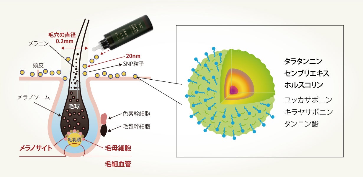 また、SUNA製品にはメラニンの生産を促進する効果があるオリジナル成分の「タラタンニン*」を配合し、SNP技術で有効成分を毛根までダイレクトに浸透・吸収させることを可能としました。
