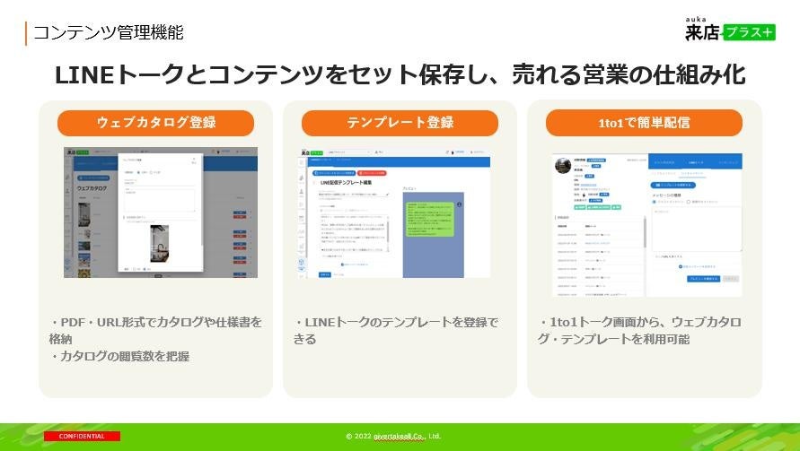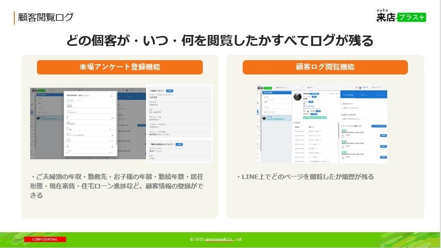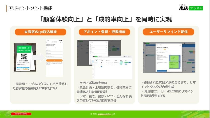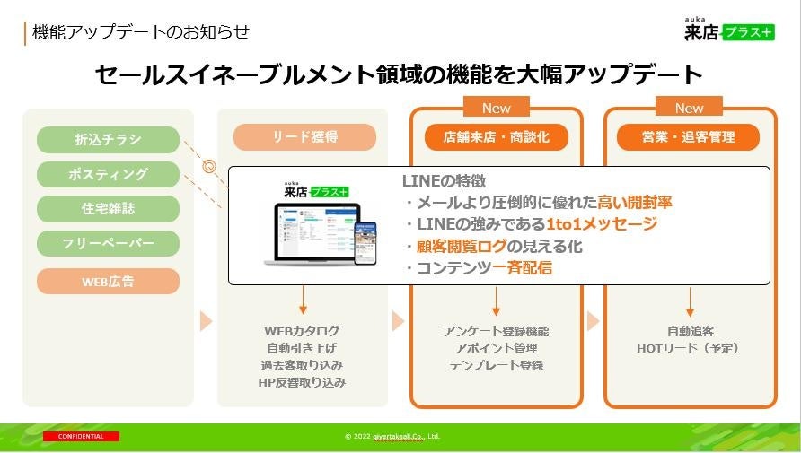 LINEを活用した工務店向けのマーケティング&セールス支援ツール「アウカ来店プラス」を提供するギバーテイクオール株式会社(本社:東京都港区、代表取締役CEO 河野清博、以下当社)は、セールスイネーブルメント領域の大幅な機能アップデートを実施致しました。住宅営業の現場において広く普及しているLINEを活用することで、住宅業界で普遍的な課題であった「属人化問題」「ブラックボックス問題」「ばらつき問題」を解消し、産業全体における営業生産性の大幅な向上を目指します