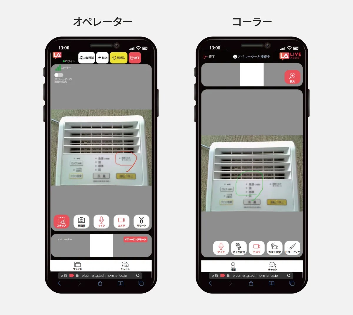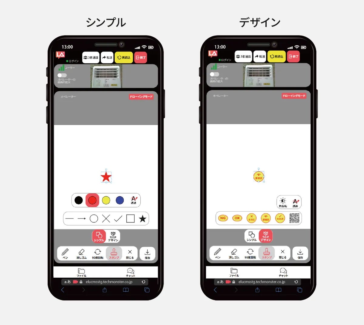 操作中のライブ映像にペンツールでドローイングができるようになります。オペレーターが赤ペン、コーラーが緑ペンを使って通話映像画面上にフリーハンドで描く機能です。