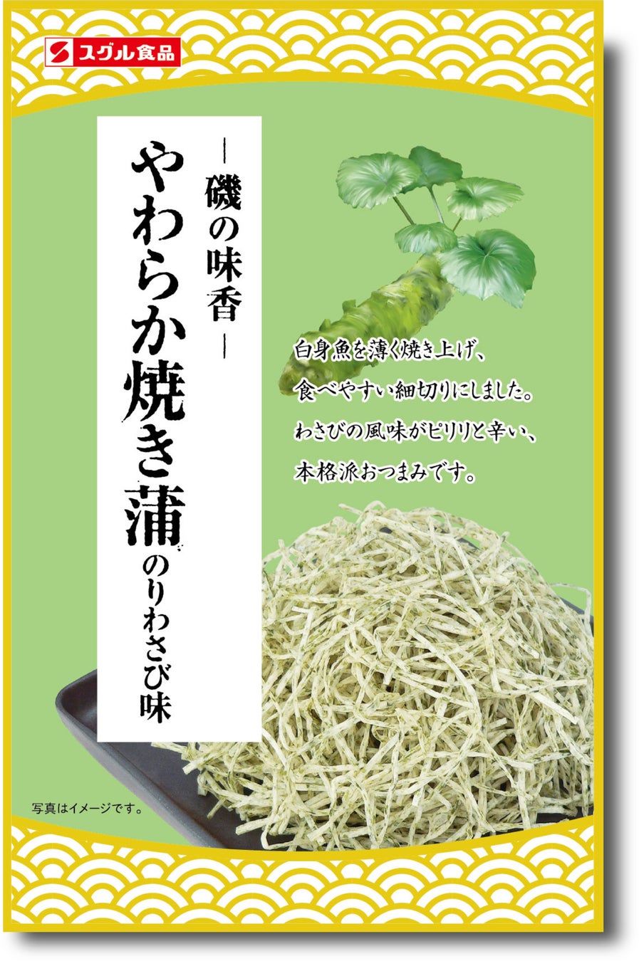 今回新たにシリーズに加わる「やわらか焼き蒲 のりわさび味」は、魚肉のすり身にあおさを練りこみ、わさびフレーバーと甘辛いタレで味付けしたおつまみです。磯の香りとわさびのピリッとした辛さが癖になる商品となっております。