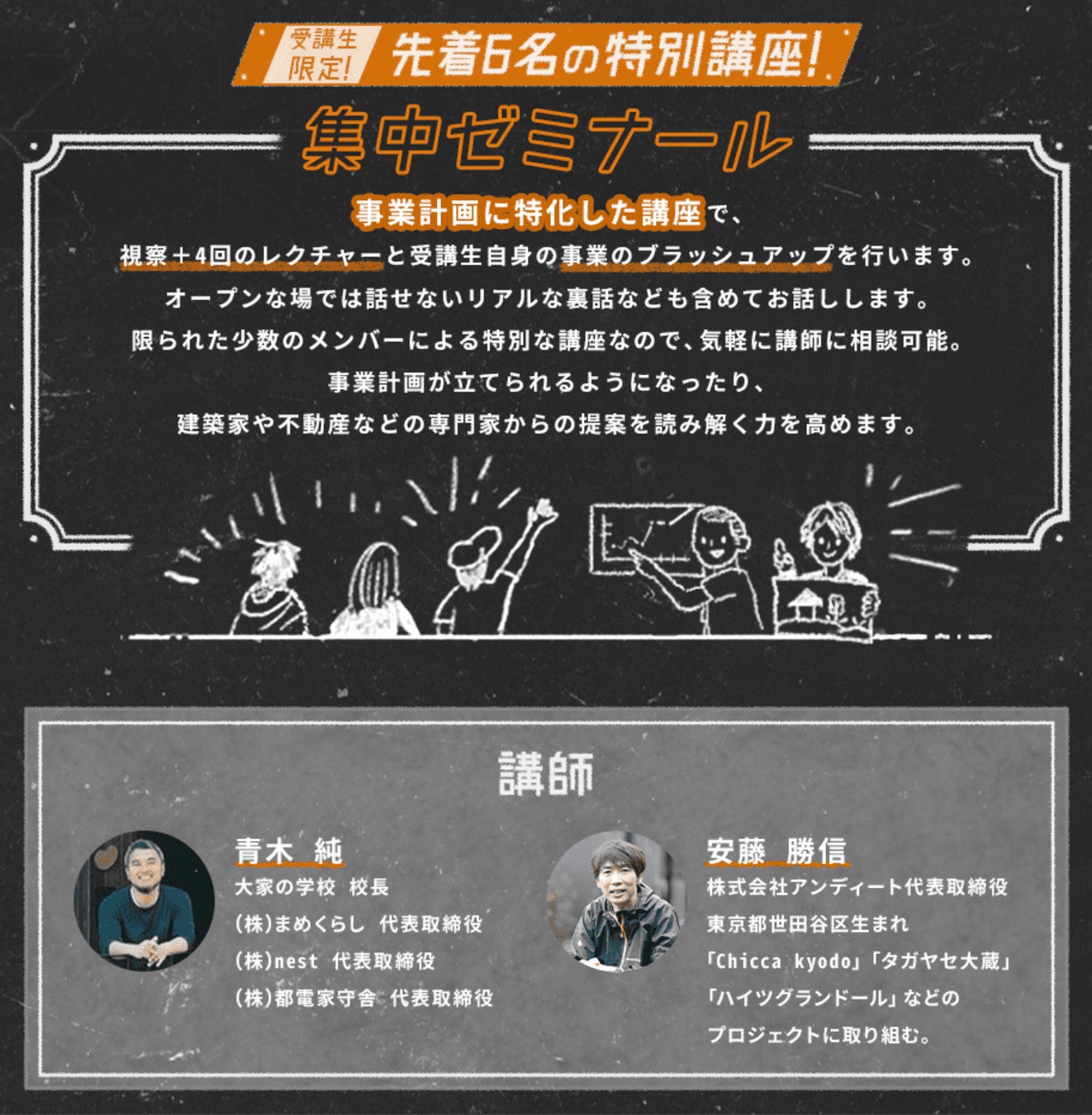 視察+4回のレクチャーと受講生自身の事業のブラッシュアップを行う、先着6名の特別講座「集中ゼミナール」を開催します。講師は、大家の学校 校長の青木純。そして、古い建物を新しい価値に再生し、住まい手の愛着や地域のつながりを育んでいる、株式会社アンディート代表取締役の安藤勝信氏が務めます。初回の視察では、安藤氏が拠点とする世田谷・経堂などでの視察を行います。限られた少数のメンバーによる特別な講座なので、オープンな場では話せないリアルな裏話なども含めてお話しします。気軽に講師への相談も可能です。事業計画が立てられるようになったり、建築家や不動産などの専門家からの提案を読み解く力を高めます。