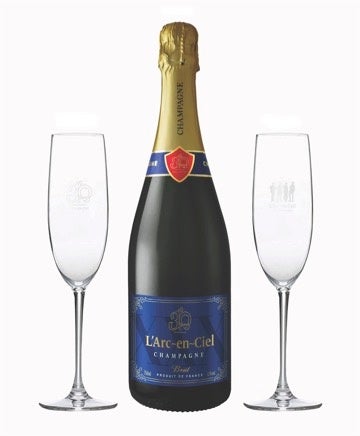 特製化粧箱に、フランスシャンパーニュ地方で長期熟成された「シリアルナンバー入りシャンパン」と「オリジナルフルートグラス(2個)」をセットしました。中敷きに使用しているサテン布はスカーフとしてもお使いいただけます。