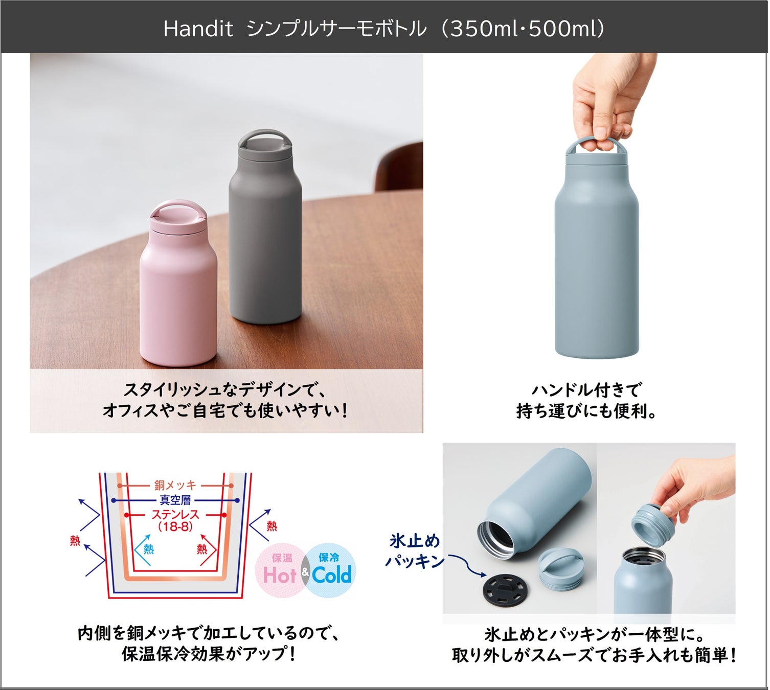 また、ボトルの内側を銅メッキ加工し、保冷保温効果を高めています。さらに、氷止めとパッキンを一体化させたことでお手入れが簡単になり、洗いやすさにもこだわった商品です。