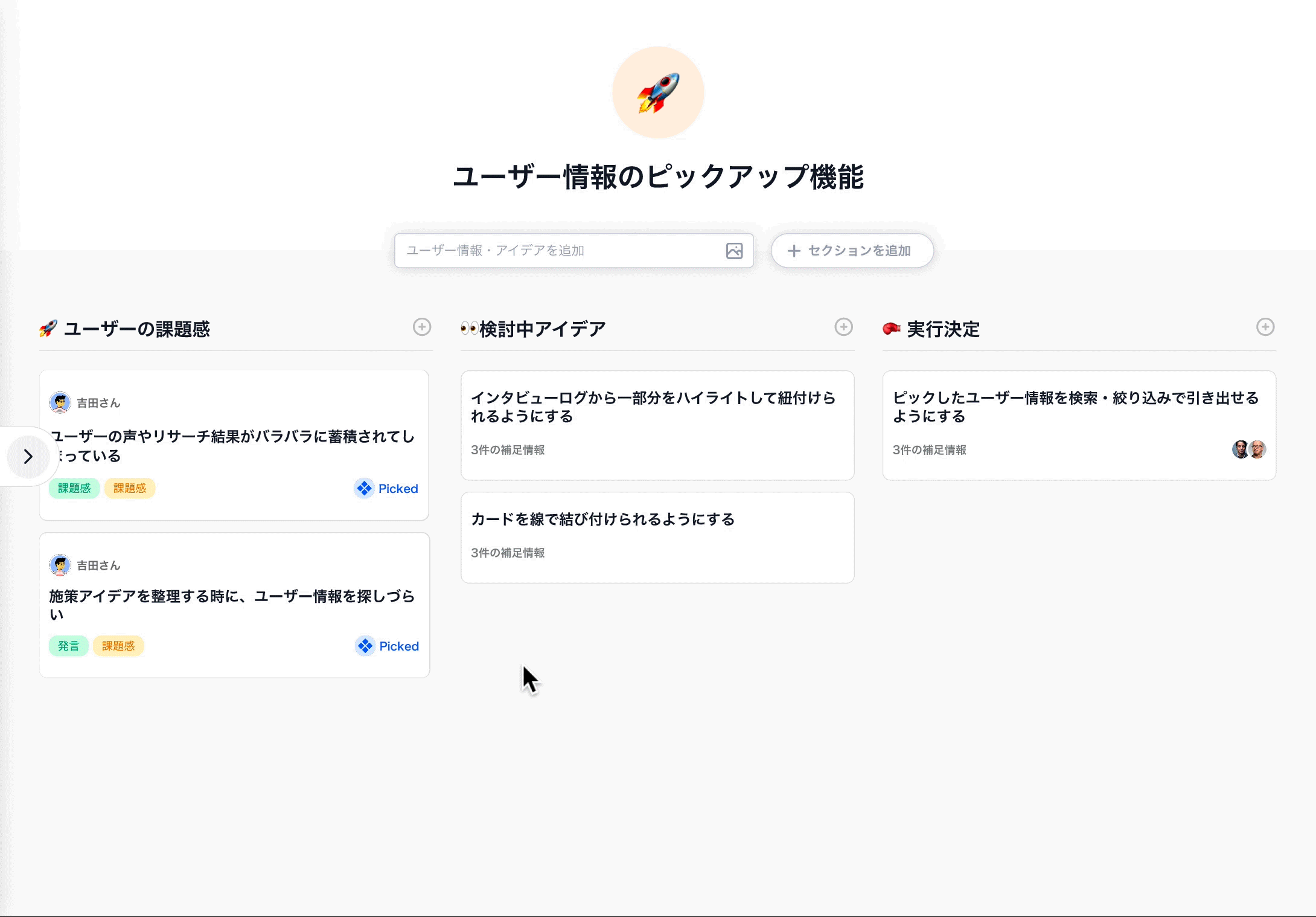 ユーザーの声やリサーチ結果を、一箇所に分かりやすく整理することができます。