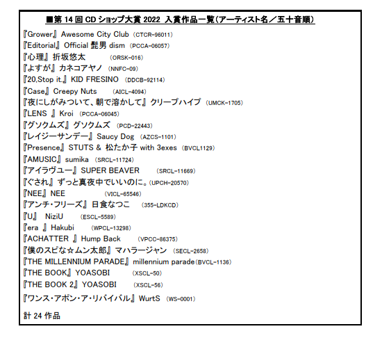 第 14 回 CD ショップ大賞 2022 入賞作品は、2021 年 1 月 1 日~2021 年 12 月 31 日に発売された邦楽の新譜(ベスト盤を除く)を対象とし、全国各地域の 347 名の CD ショップ店員が投票に参加し投票上位 24 作品を入賞作品として選出いたしました。入賞作品は下記の通りです。