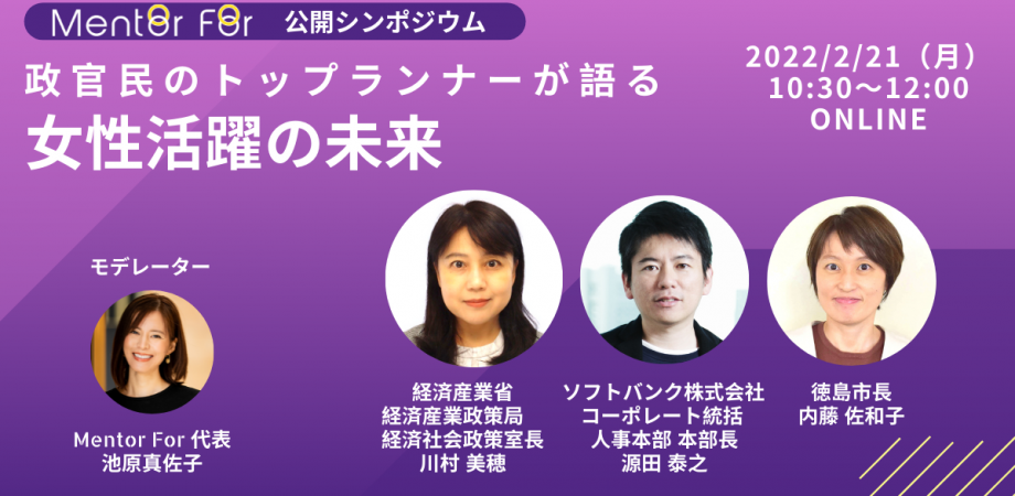 社外メンターの育成・マッチングを提供する株式会社Mentor For(東京都渋谷区、代表取締役・池原真佐子、以下Mentor For)は、2022年2月21日(月)に経済産業省経済社会政策室・川村 美穂室長、ソフトバンク株式会社コーポレート総括人事本部・源田 泰之本部長、徳島市・内藤 佐和子市長をゲストに迎え、政官民それぞれの視点から、女性活躍推進の現状・課題・取り組みをお話しいただく公開シンポジウムを開催致します。