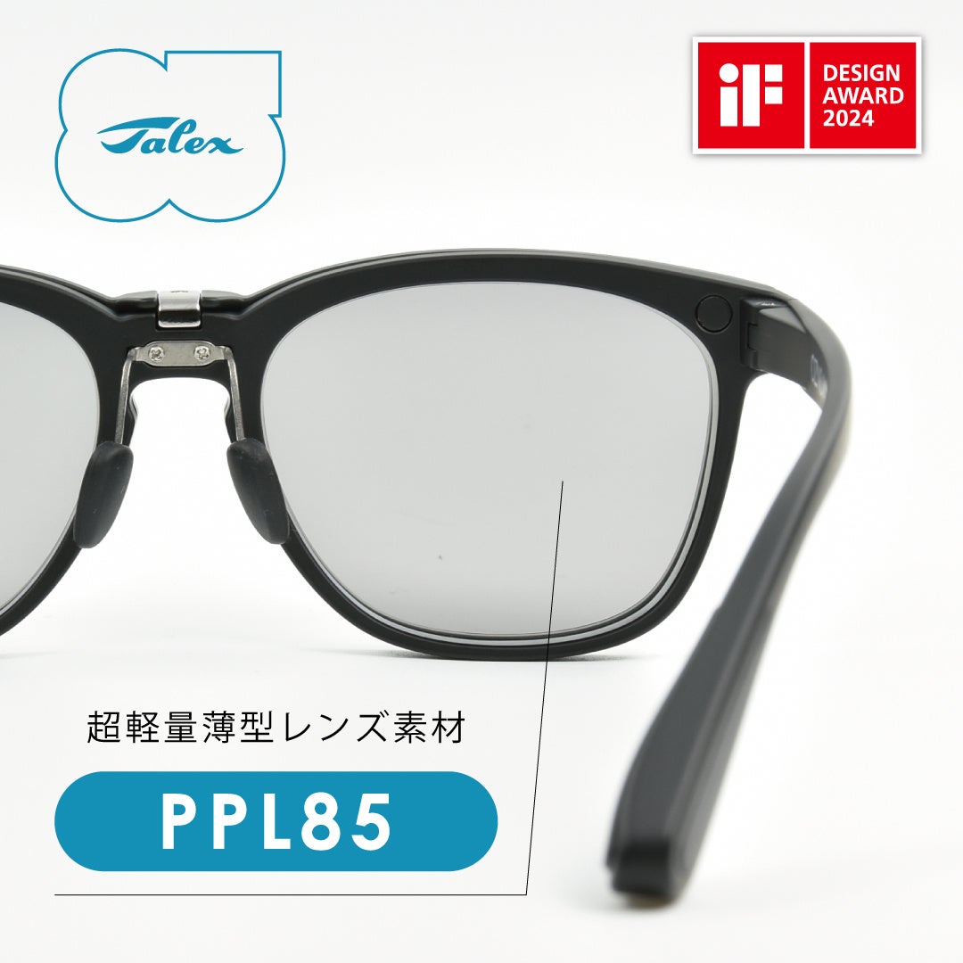 創業85周年の技術の結晶としてTALEX 史上、最薄・最軽量レンズが誕生しました。TALEX定番レンズ素材PPL75より総重量40%の軽量化に成功した新素材PPL85を採用。フレームを重ね合わせる本商品でも、重さを感じさせない快適な掛け心地の実現に一役買っています。