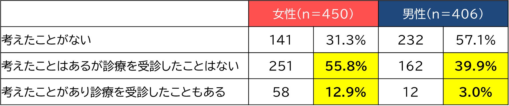 また、自覚症状について「更年期」の可能性を疑うのは、女性が7割弱(68.7%)に対し、男性は4割程度(42.9%)に。そのうち、実際に診療を受診した人は、女性では12.9%、男性では3.0%と非常に少ない結果となりました。この結果より、男性の「男性更年期」に対する認識の低さが、不調を加齢や疲労として見過ごし、更年期症状や障害の深刻な放置につながっていることが伺えます。