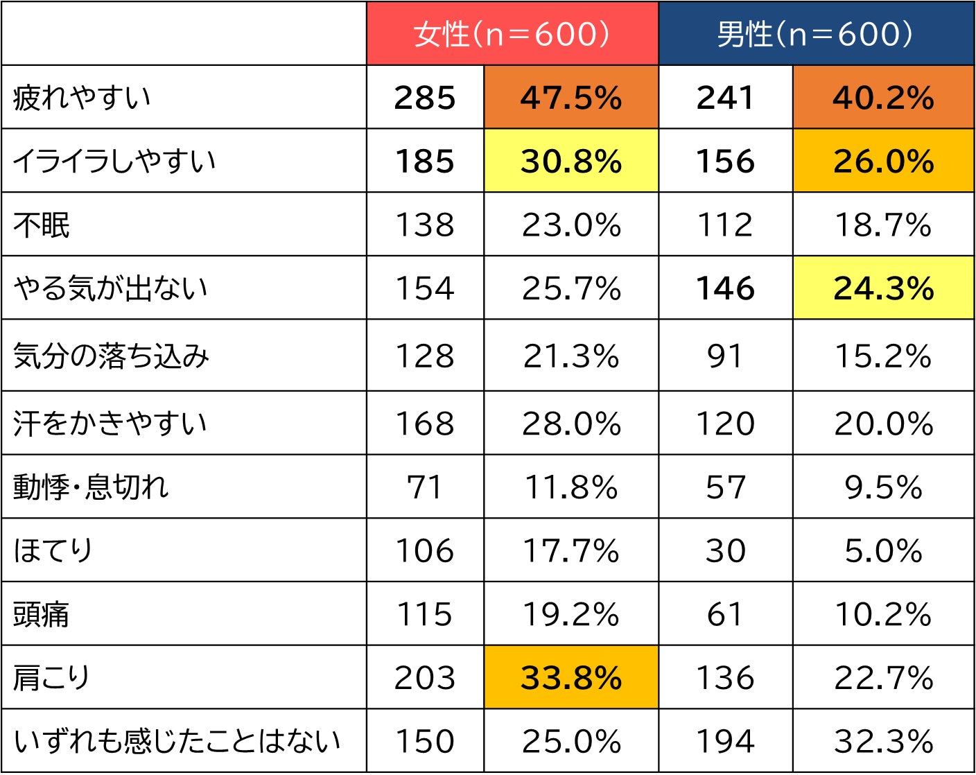 更年期世代の男女は日常生活で様々な症状を自覚していますが、内容や自覚度には男女差が見られました。男女共通で最も多く自覚された症状は「疲れやすい」で、女性47.5%、男性40.2%と約半数に上ります。女性では、続いて「肩こり」「イライラしやすい」が多く、男性では「イライラしやすい」「やる気が出ない」が続く結果となりました。一方、男性の約3人に1人は「いずれの症状も感じたことがない」と回答しており、男女間で症状の自覚の差が大きいことが伺えます。