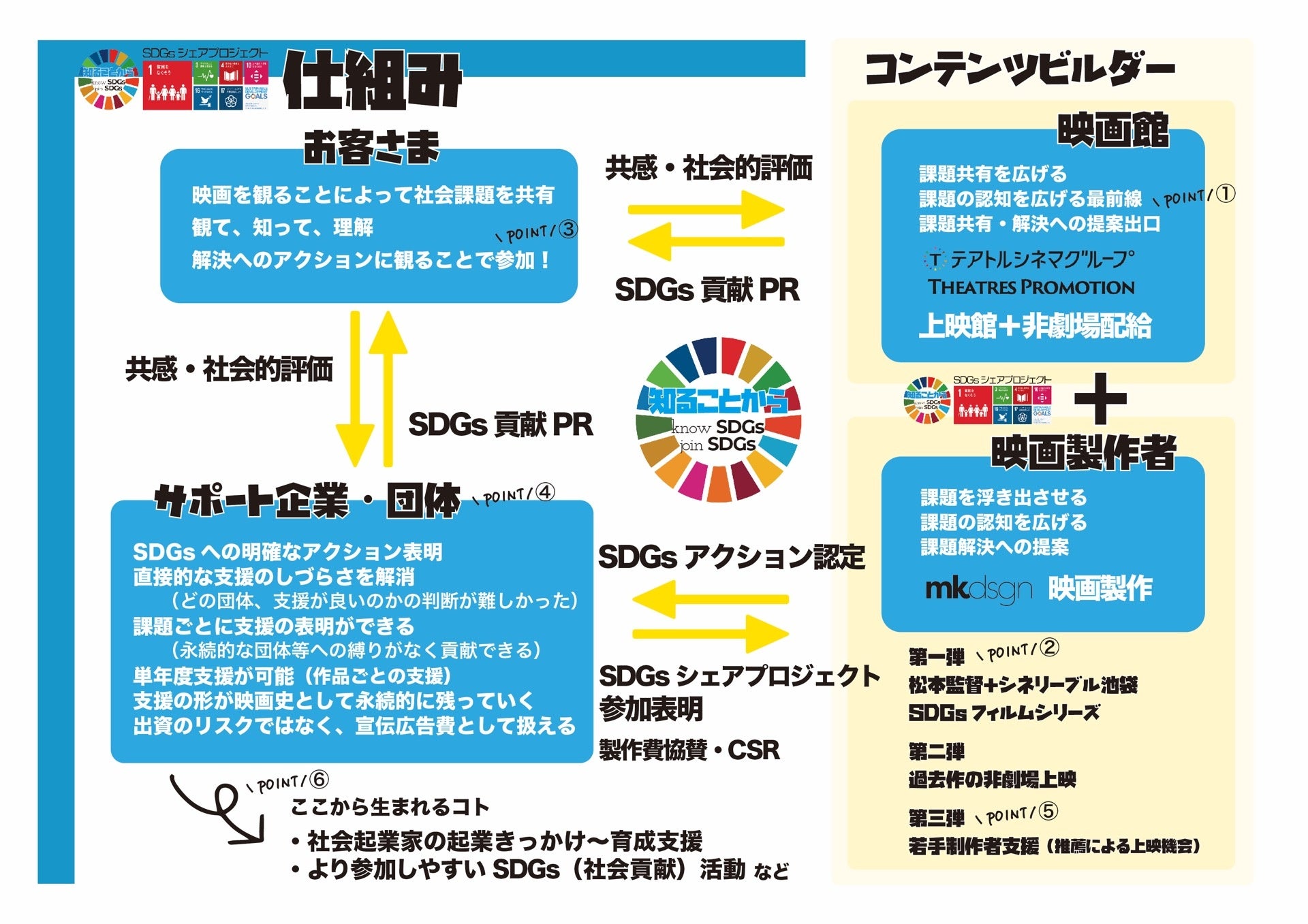 「SDGsシェアプロジェクト」は企業、団体からのサポート参加も積極的に受け付けます。取り組みたい課題ごとに参加表明をしていただき、出資という形ではなくCSR的な考え方での協賛金で支援いただく仕組みです。それが制作費、宣伝費として生かされ、よりダイレクトに課題へのアプローチと周辺共有者とのコネクトができ、課題への取り組みが明確になると同時に、映画として関わりが確実に残っていきます。
