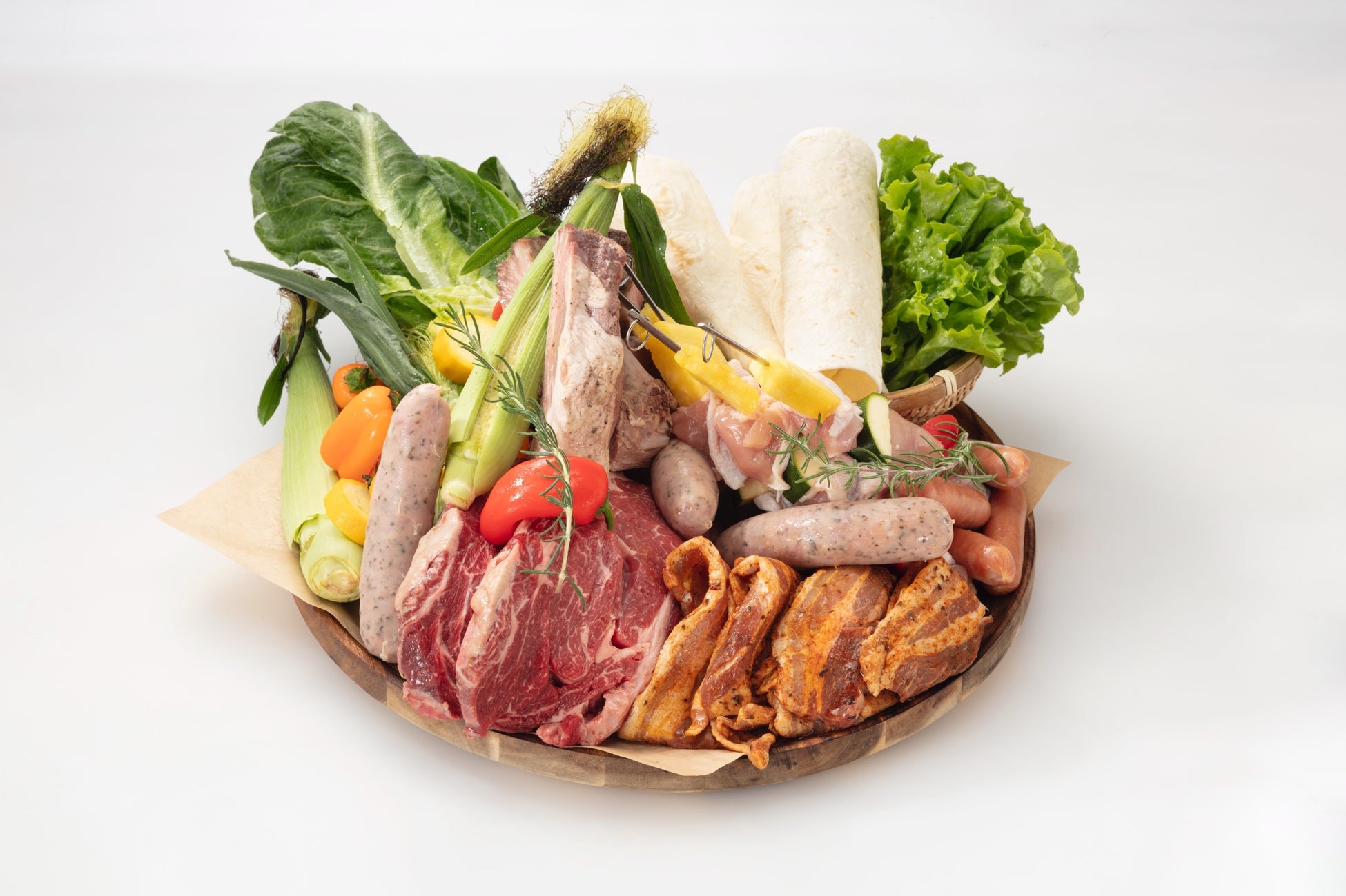 ・短角牛 / スパイシーポーク / チキンプロシェット / スペアリブ / ソーセージ / 焼き野菜 / トルティーヤ