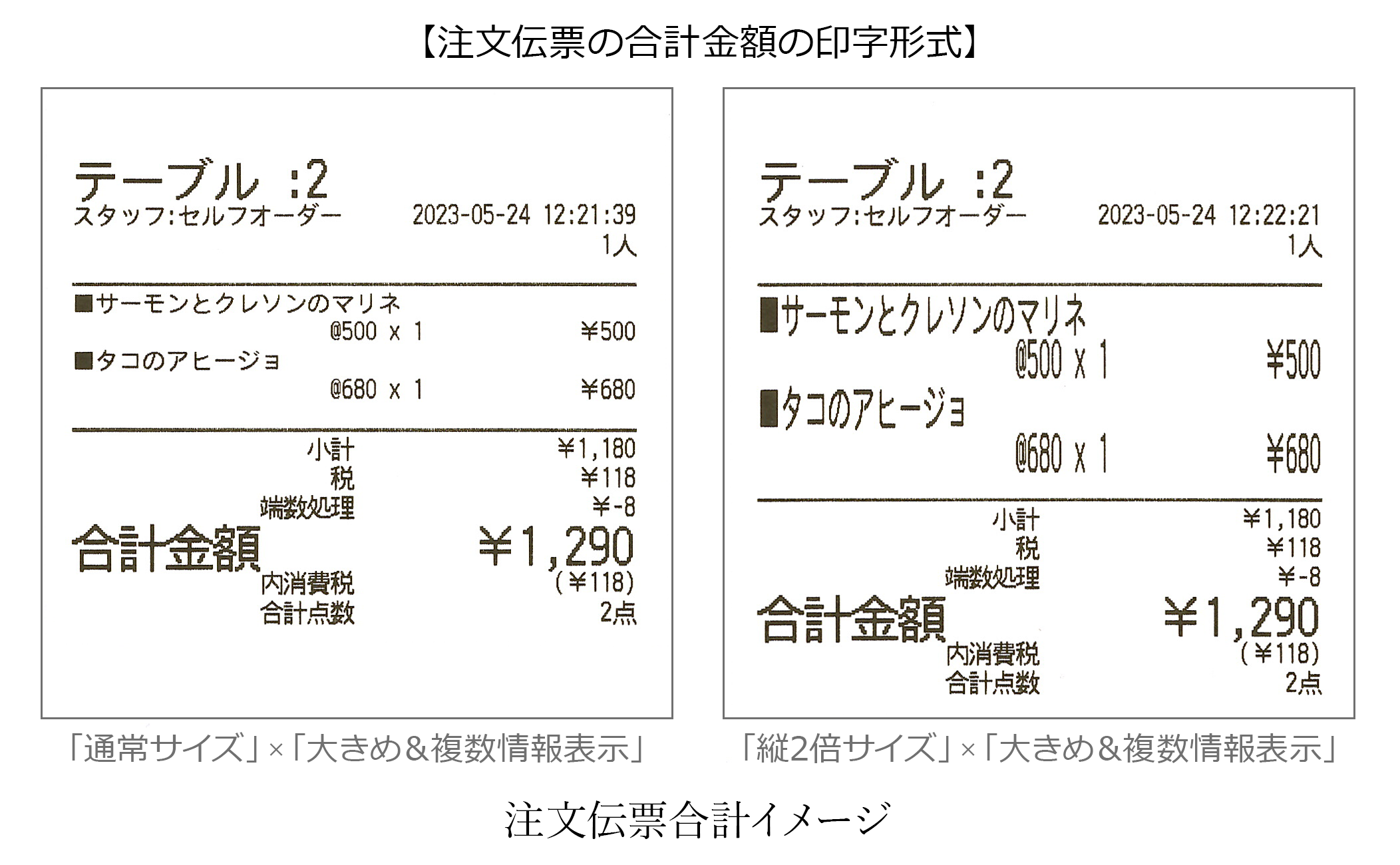 ・注文伝票の合計印字形式を「シンプル表示(従来)」と「大きめ&複数情報表示」