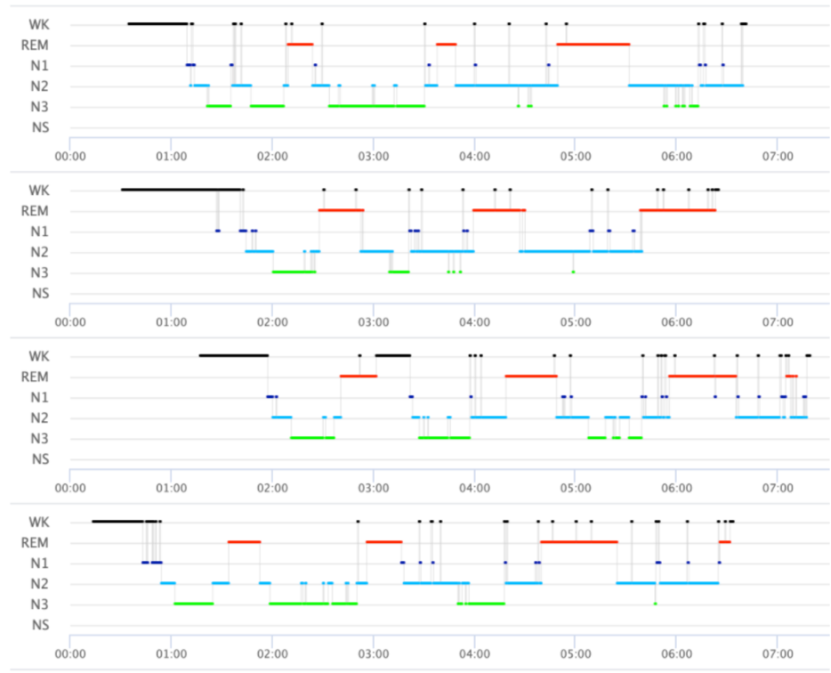 4晩とも寝付きに時間がかかっているが、入眠以降は最も深い睡眠も十分に取れており、睡眠の質が良い。