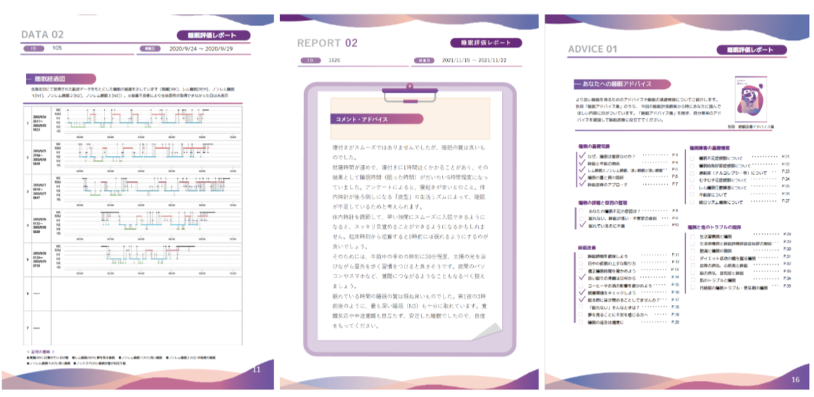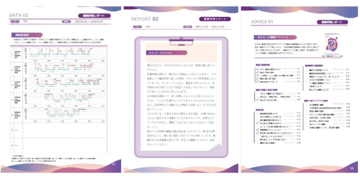 また、睡眠改善策を提示する睡眠計測レポートもリニューアルし、睡眠の専門家からのアドバイス欄を大幅に拡充。「睡眠時間」「睡眠の質」などといった観点ごとの簡易評価や、「睡眠トラブルの網羅的スクリーニング」の専用欄も新設し、個々の課題を明確に伝えます。