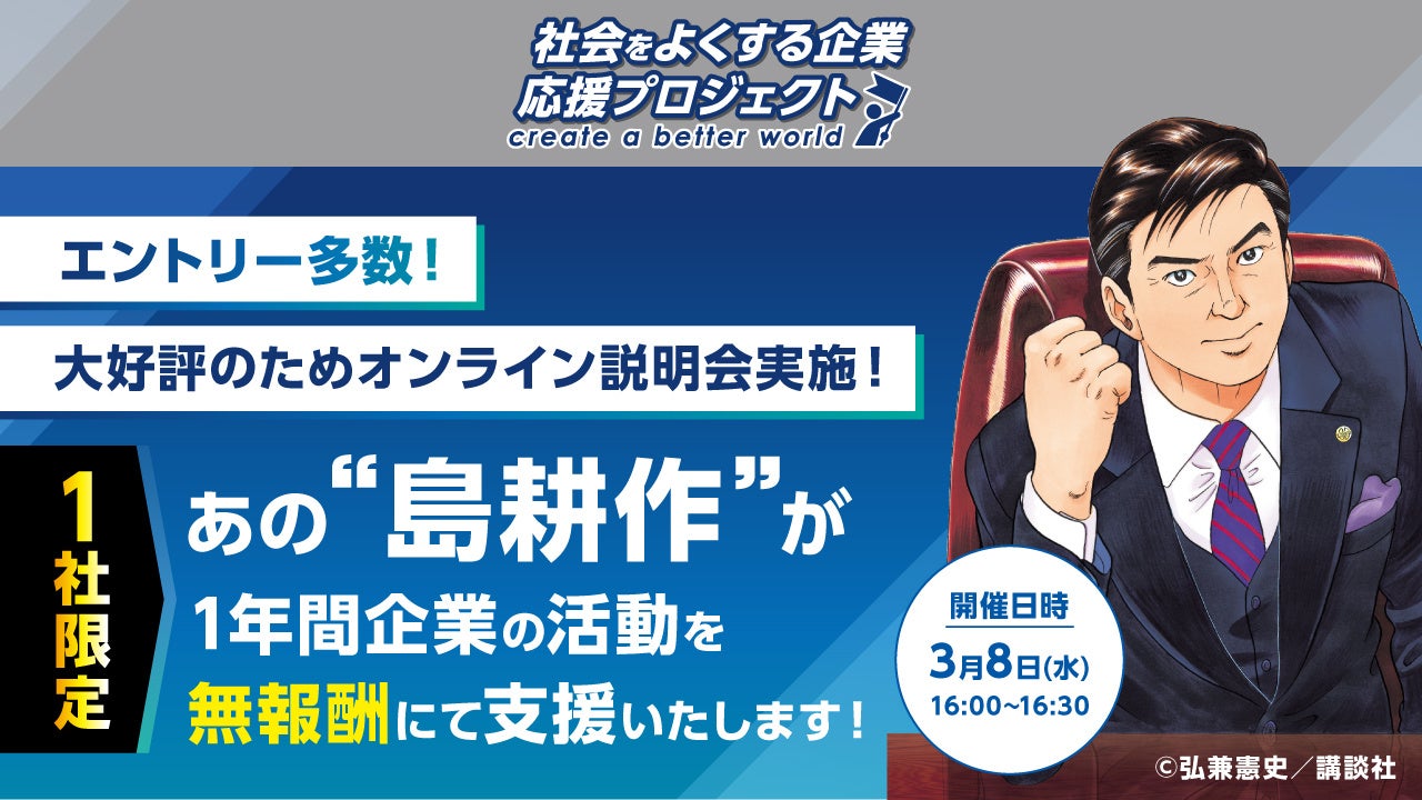 【あの“島耕作”が無報酬で支援!】「社会をよくする企業応援プロジェクト」エントリー多数で大好評のためオンライン説明会の実施が決定!【3/8(水) 16時~開催】!キャンペーンエントリー受付中。