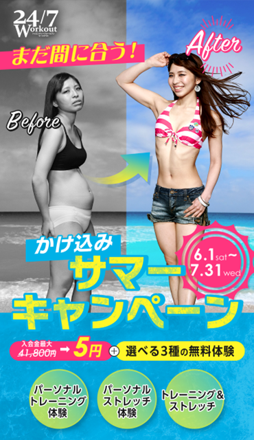 多くのダイエッターを悩ませるこの季節の対策として、私たち24/7Workoutは7月31日(水)までの期間限定で、普段よりもお得にご入会でき、お悩みに対してダイレクトにアプローチできるキャンペーンをご用意いたしました。