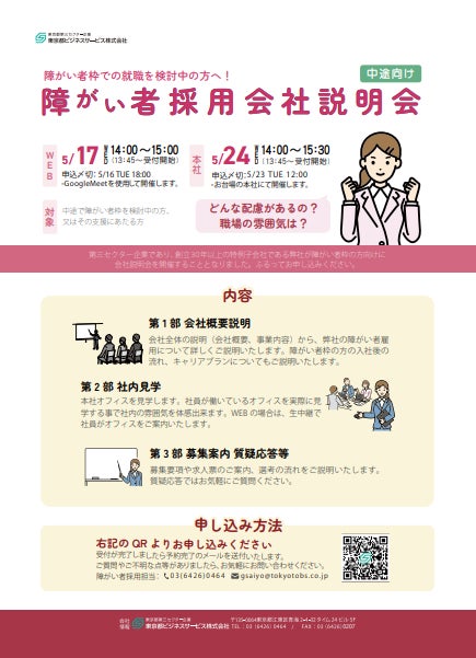 この度、東京都が出資する第三セクター企業である東京都ビジネスサービス株式会社(本社:東京都江東区、代表取締役社長:根津史明、以下「当社」)は、障がい者枠での就職を検討されている方を対象とした、5月度の会社説明会を開催することとなりましたので、お知らせいたします。
