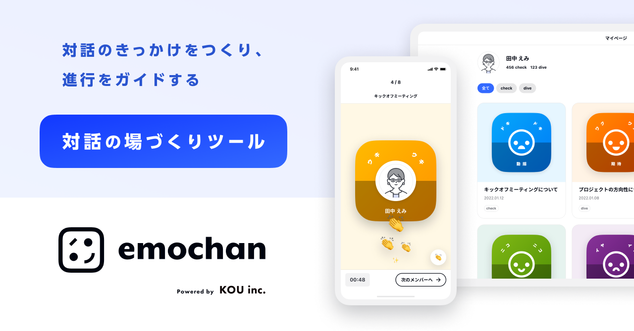 「emochan」は、日々の対話のきっかけをつくり、進行をガイドする、対話の場づくりツールです。2022年2月2日から法人向けに提供開始。