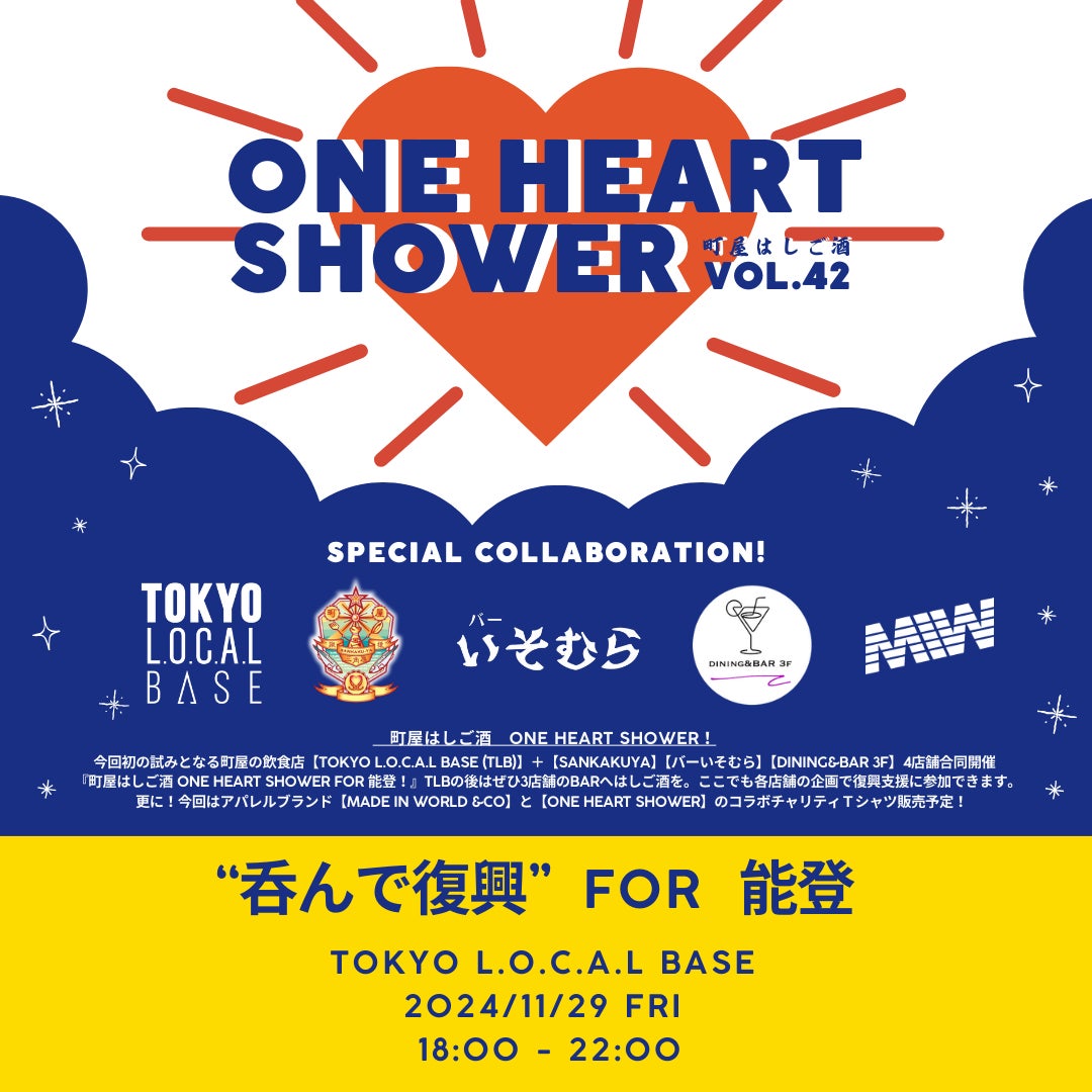 被災地の「復興支援」や「地域活性化」を活動の目的とするNPO法人TOKYO L.O.C.A.L (東京都荒川区/代表理事:丸山慎二郎)は、被災地に直接行けない方々にも災害支援を身近に感じていただくため、復興支援イベント『ONE HEART SHOWER vol.42 for能登』を11月29日(金)18時より開催いたします。“飲んで復興”をコンセプトに、通算42回目となる今回は、荒川区町屋にある人気飲食店4店舗による初の合同開催が実現。東京で能登半島への支援活動に取り組みます。