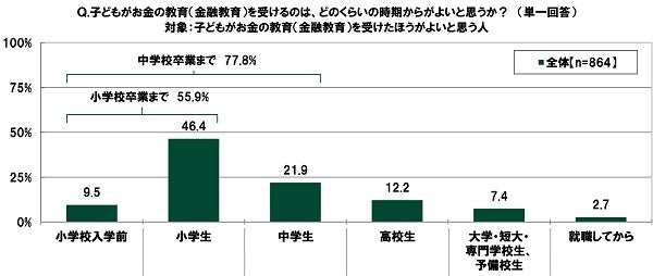 子どもがお金の教育(金融教育)を受けたほうがよいと思う人(864名)に、子どもがお金の教育(金融教育)を受けるのは、どのくらいの時期からがよいと思うか聞いたところ、「小学校入学前」が9.5%、「小学生」が46.4%、「中学生」が21.9%、「高校生」が12.2%、「大学・短大・専門学校生、予備校生」が7.4%、「就職してから」が2.7%となりました。累積比率をみると、『小学校卒業まで』は55.9%、『中学校卒業まで』は77.8%となりました。親の半数は、子どもが小学校を卒業するまでにはお金の教育を受け始めてほしいと考えているようです。