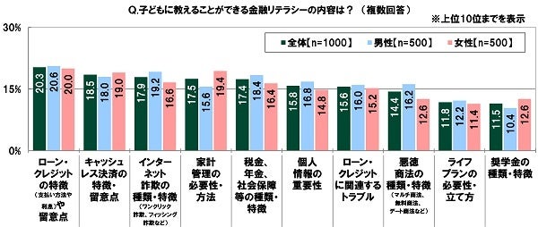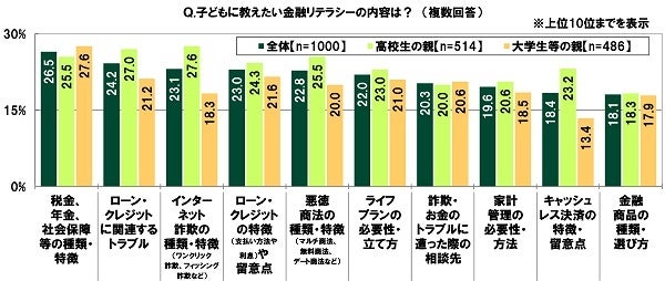 - 子どもに教えたい金融リテラシー 高校生の親では「インターネット詐欺の種類・特徴」、大学生等の親では「税金、年金、社会保障等の種類・特徴」が1位