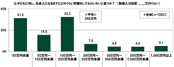 子どもに対し、社会人になるまでにどのくらい貯蓄をしてもらいたいと思うか聞いたところ、「50万円未満」(31.2%)や「100万円~200万円未満」(32.3%)に回答が分かれ、平均は266万円でした。
