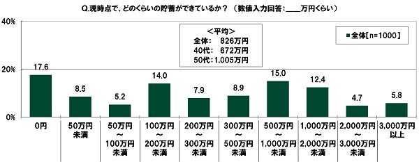 - 現時点の貯蓄額 平均は40代672万円、50代1,005万円 「貯蓄額が0円」は17.6%