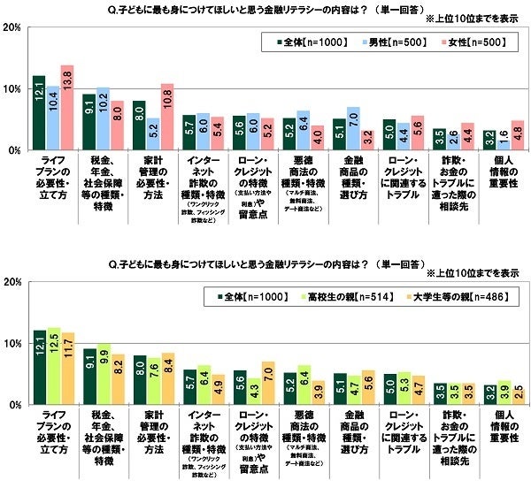 - 子どもに最も身につけてほしいと思う金融リテラシー 1位「ライフプランの必要性・立て方」 高校生の親では「税金、年金、社会保障等の種類・特徴」、大学生等の親では「家計管理の必要性・方法」が2位