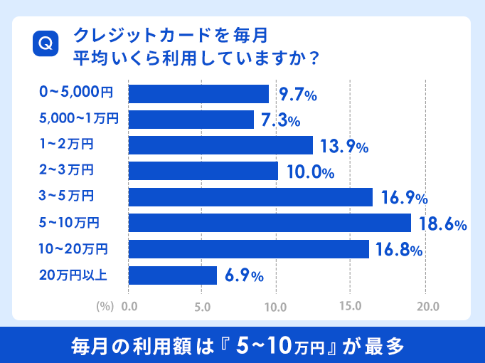 クレジットカードの利用額が毎月平均、『5~10万円』(18.6%)の利用が最多回答になりました。