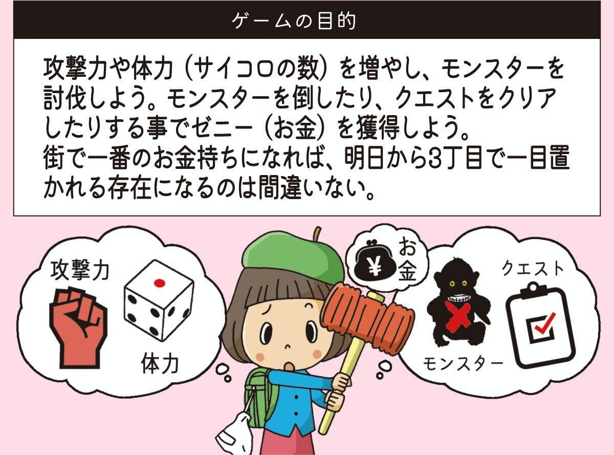 目指すは街で一番のお金持ち。装備を整え、攻撃力や体力(サイコロ)を増やしていき、スキルや必殺技を駆使しながら、モンスターや大ボスを倒してお金を稼ぎましょう。クエストをクリアする事で一攫千金も狙えます。