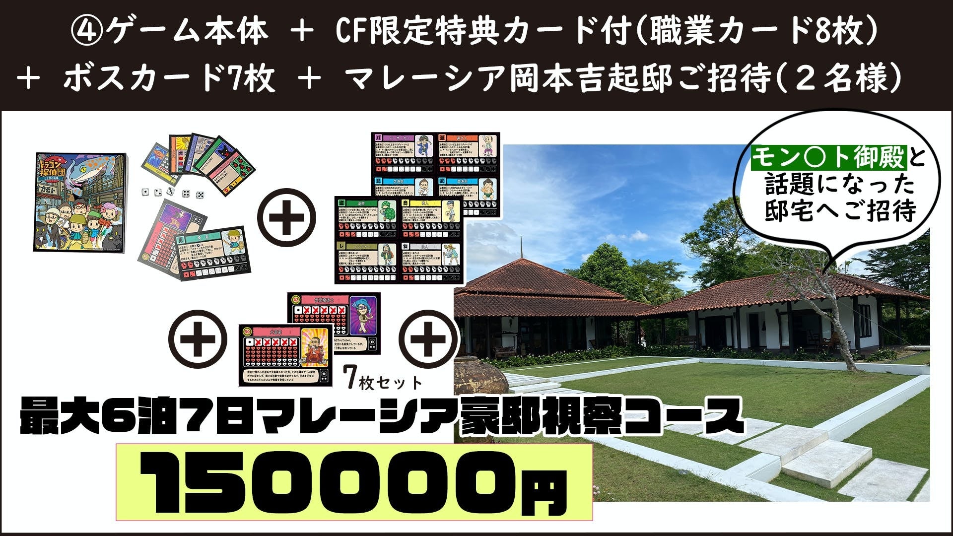 お礼とリターンは、ゲーム本体+限定特典カードから、岡本吉起のマレーシア豪邸視察コースまで多種多様!