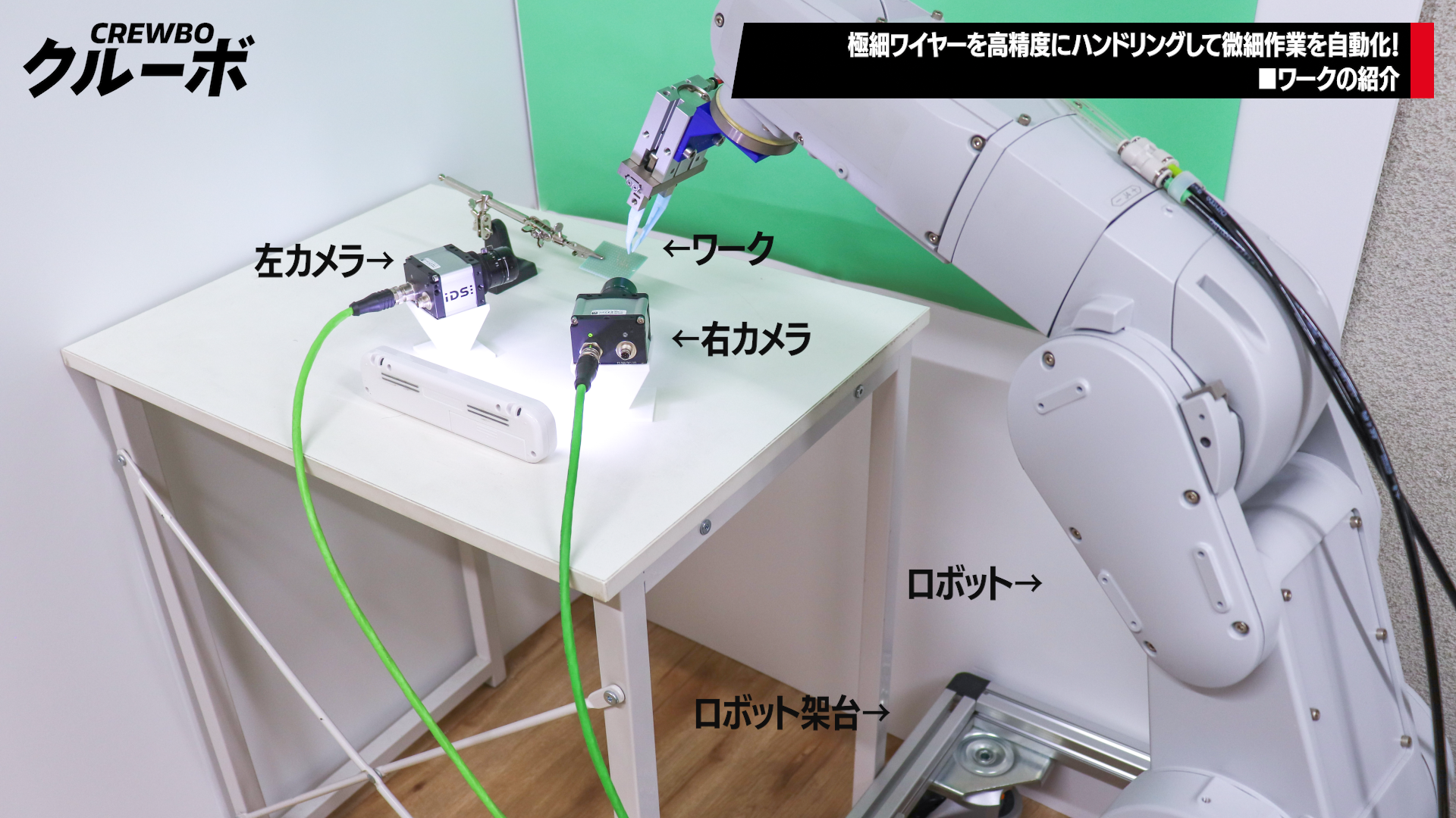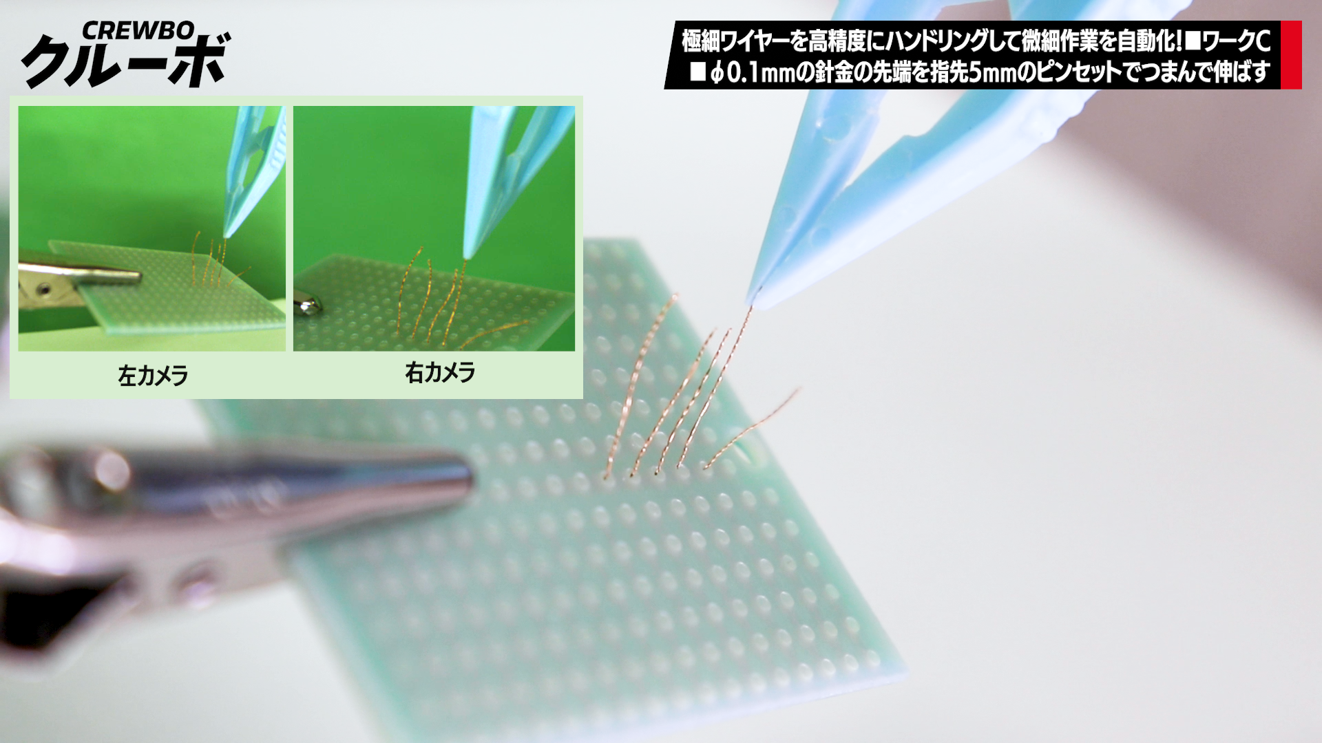 ラフに設置したロボットアーム、カメラを使用して、ピンセットを装備したエンドエフェクタで、ワークからはみ出たワイヤーを取り除く「ヒゲ取り」を実装しました。左右の2台のカメラそれぞれで、ワイヤー先端部分とピンセット先端部分を画像認識することで、極細ワイヤーの位置を認識しながらリアルタイムビジュアルフィードバック制御を行っています。