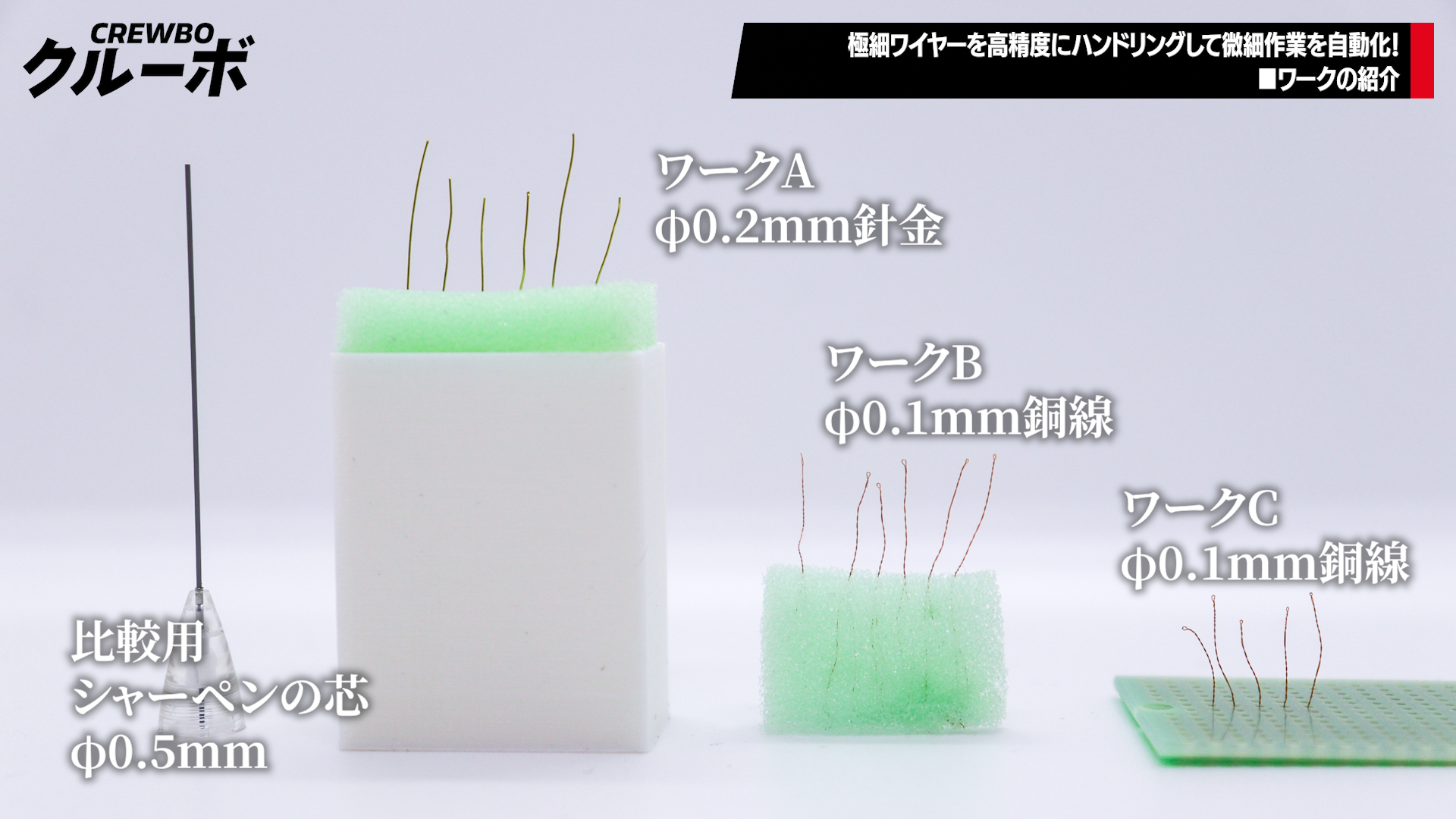 さらに、自動化対象となるワークは、髪の毛と同じ細さとされる直径0.1mmの超細線ワイヤーです。一般的なシャープペンシルの芯と比較するとその細さは明確です。