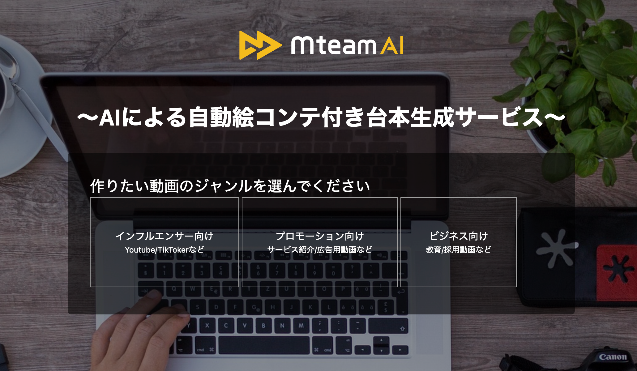 MTEAM-AIは、ChatGPTを搭載した、動画制作に関わる絵コンテ・台本生成サービスです。