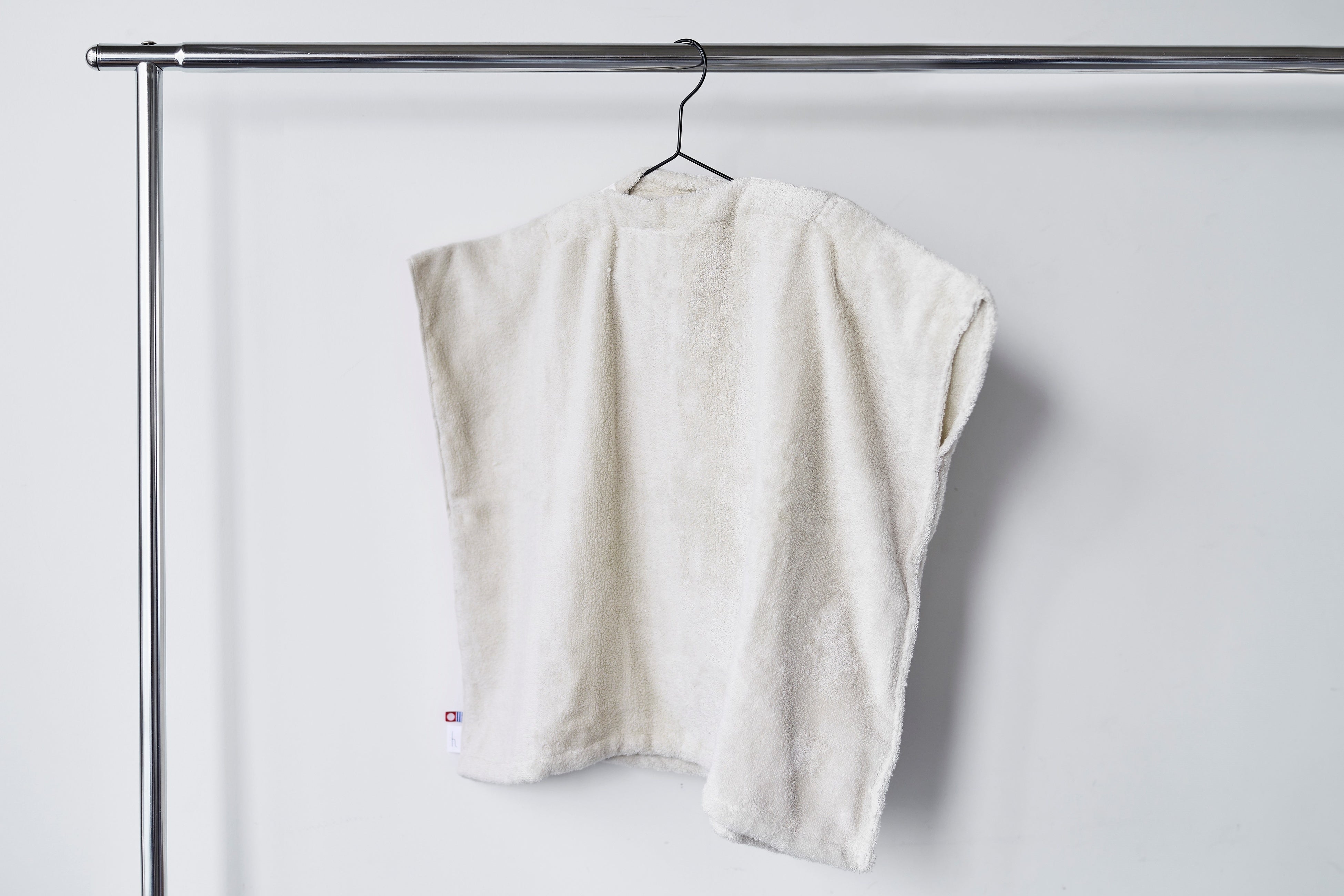 h tag「bath towel」ユーザーの “肌にやさしい生地を活かし、子どもたちのお風呂あがりを快適にしたい” という声から生まれた製品です。プルオーバータイプのゆったりとした形状のため、さっと身体を拭いた後に簡単に着せてあげられます。首元はホックで3段階に調整できるため、歩きはじめから4~5歳を目安に、子どもの成長に合わせて使用できます。(身長目安:約90cm~)