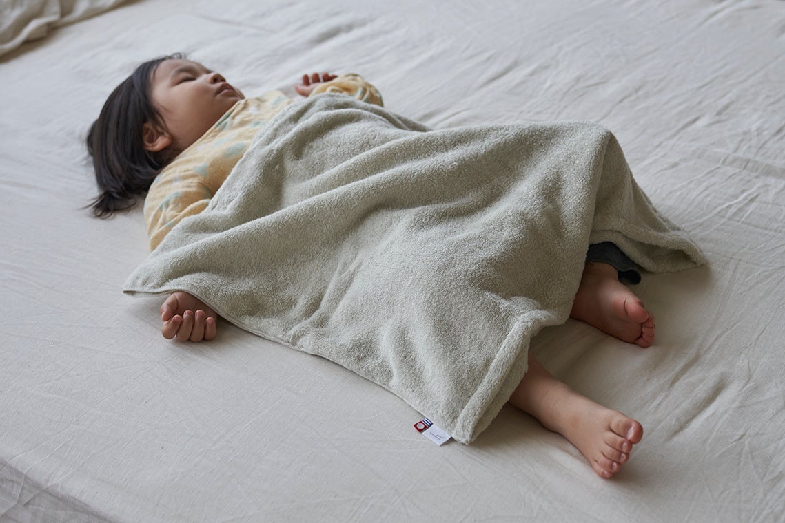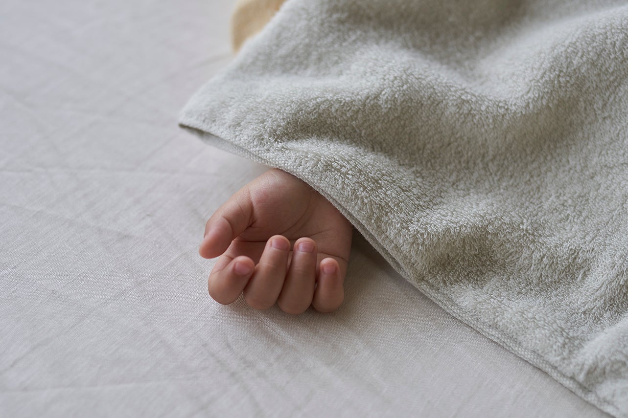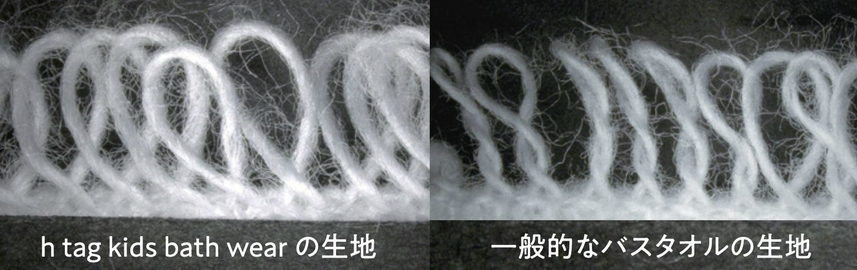 糸の表面が平滑で凹凸が少ないため、なめらかで摩擦が生まれにくく、子どもたちのデリケートな肌にも安心してご使用いただけます。繊維が長くしなやかさのある綿と、ボリューム感に優れた綿をブレンドした甘撚り綿糸で、ループが大きく立ち上がります。一般的なバスタオルと比較してねじれも少なく、ふんわりとした感触が持続します。