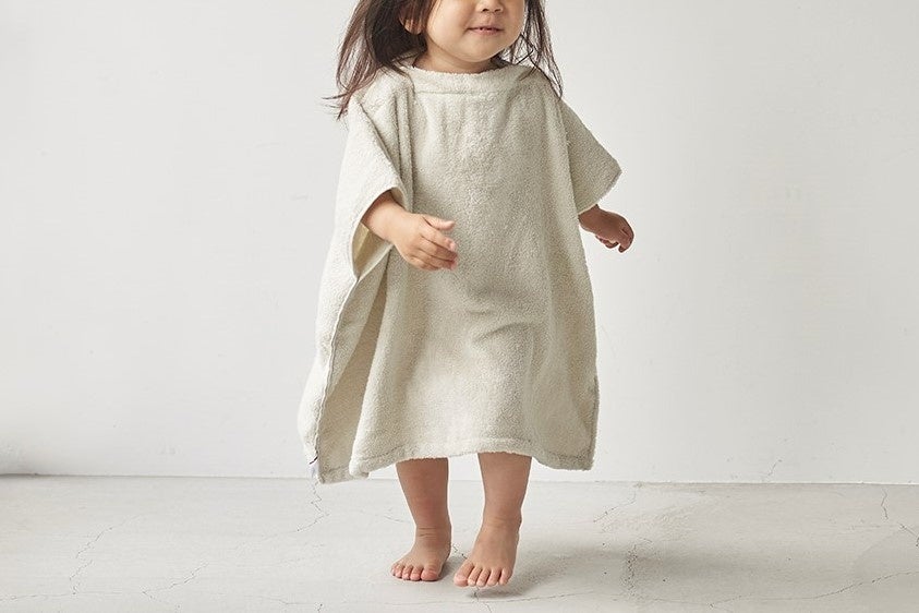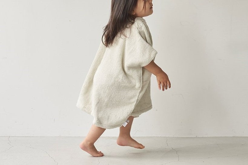 デザインを手掛けるのは、コスチューム・アーティストとして広告、 演劇、 映画、テレビなど多岐にわたり活躍するひびのこづえ氏。子どもたちの成長に寄り添う、性別を問わずに着られるシンプルなデザインは、身長や体型などに合わせて長く使えます。お風呂あがりはもちろん、プールや水遊び後のスイムタオルとしてもおすすめです。