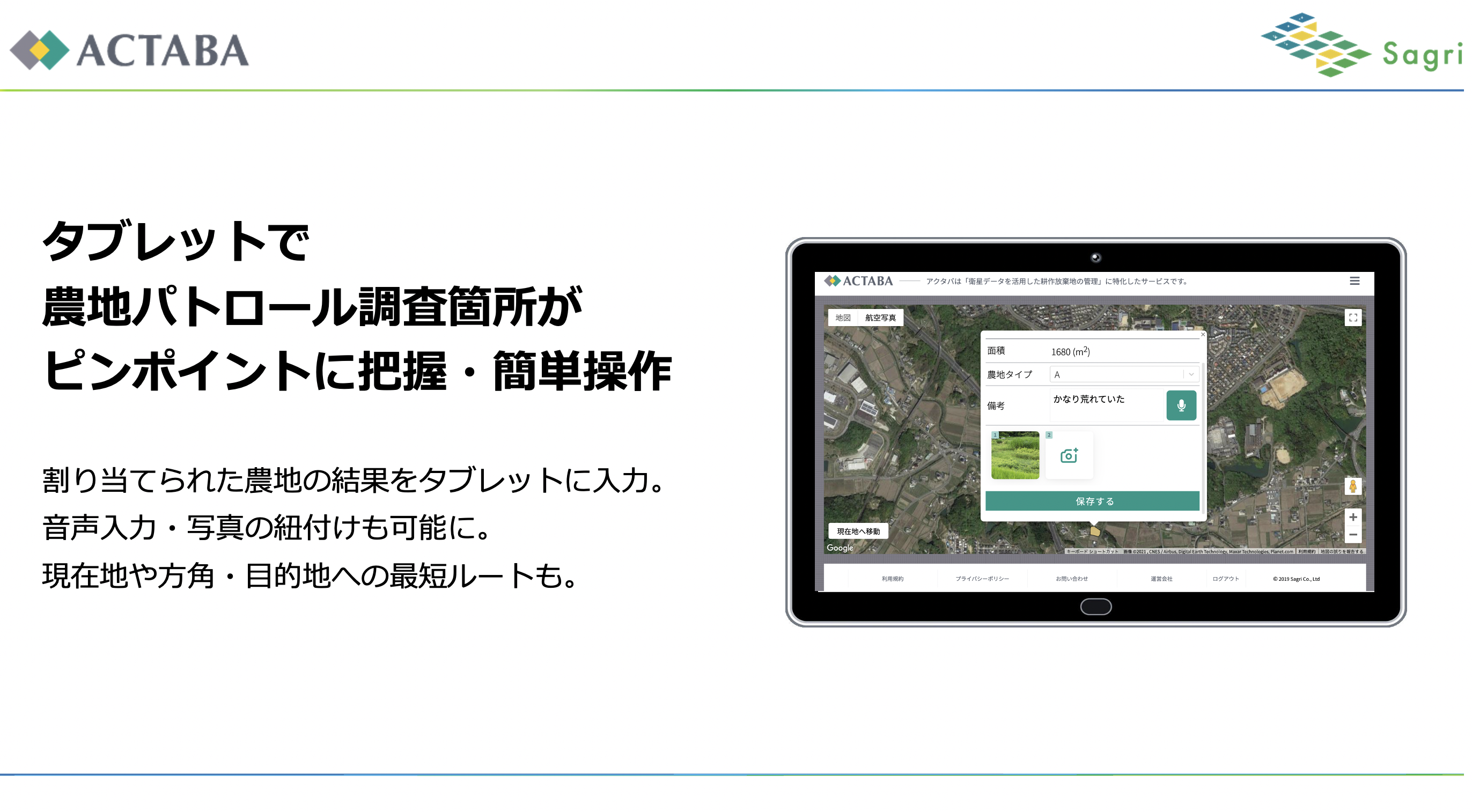 私達のアクタバは、それらを以下のように、衛星データから耕作放棄地であるかを早期に発見し、農地パトロール調査を効率化することを実現しました。農業委員会事務局職員は、インターネットに接続されたPC上で全体の管理農地を見える化することができると共に、農地パトロールを行う方それぞれに対して、農地を割り当てることができます。割当てられた農地はパトロール調査を行う人のタブレットやスマホ上に表示がされ、入力を効率化することができます。