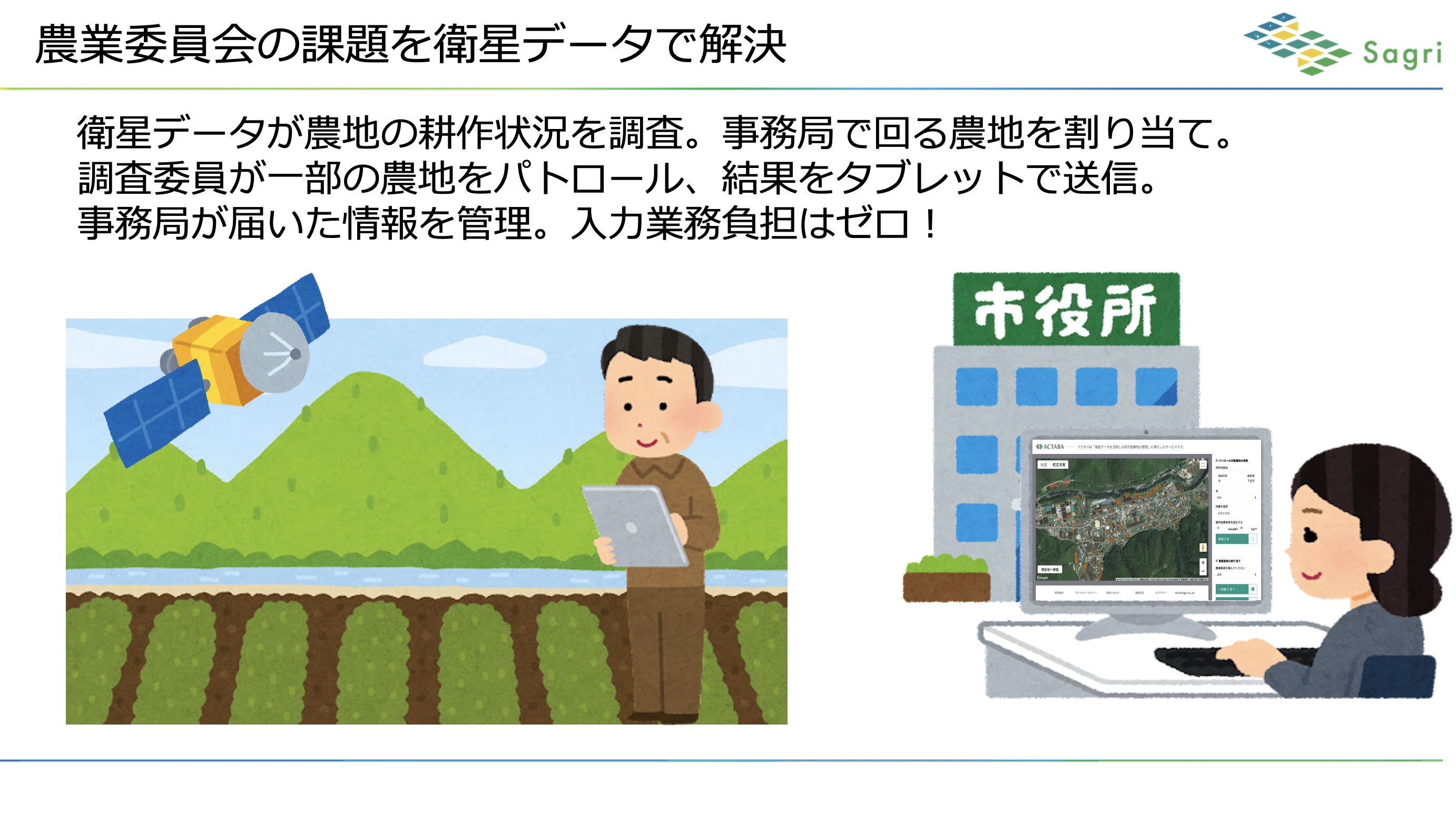 現在、かなり多くの市町村から見積もり依頼をいただいております。衛星データによる農地把握や、管理されている台帳に沿った最新農地地図の作成、タブレット等との連動システムによる入力のデジタル化、各台帳システムへの手入力負担軽減など、業務効率化、費用対効果を全国の市町村様が求めていることがわかりました。