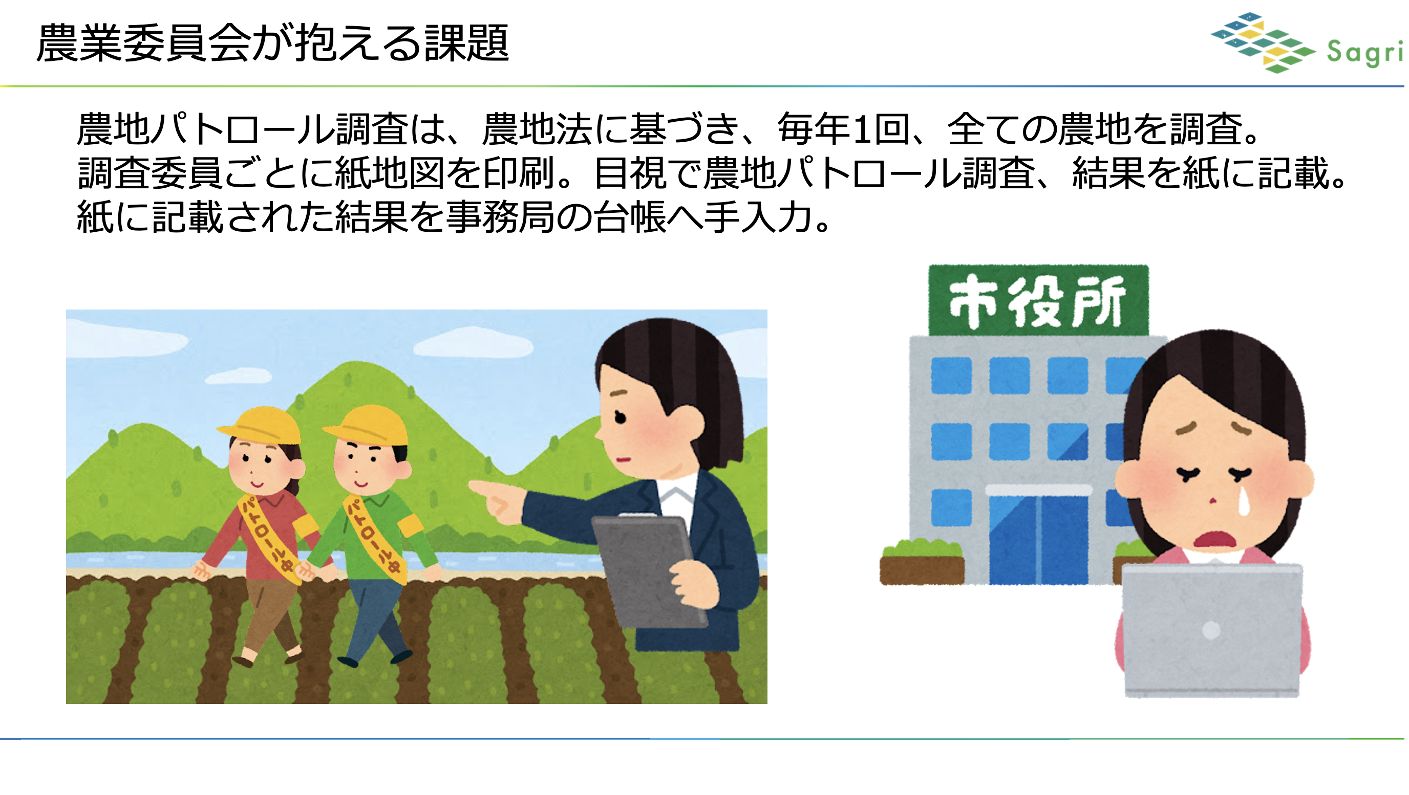 農地パトロール調査を行う方は、各市町村の農業委員会事務局職員や農業委員・農地利用最適化推進委員が行っております。基本的には、紙ベースの地図をもとに、農地の耕作状況をチェックし、市役所で管理されている台帳へと手入力業務を行っている状況です。