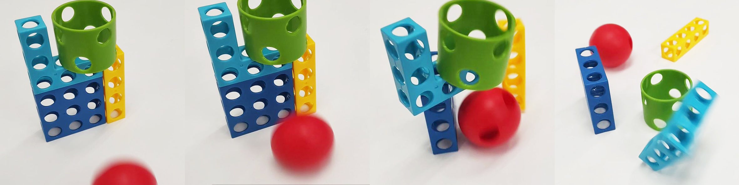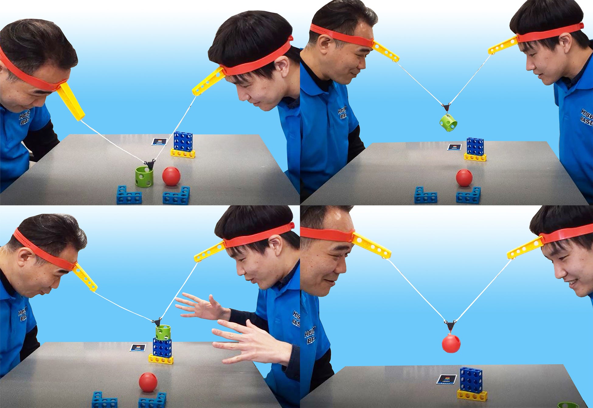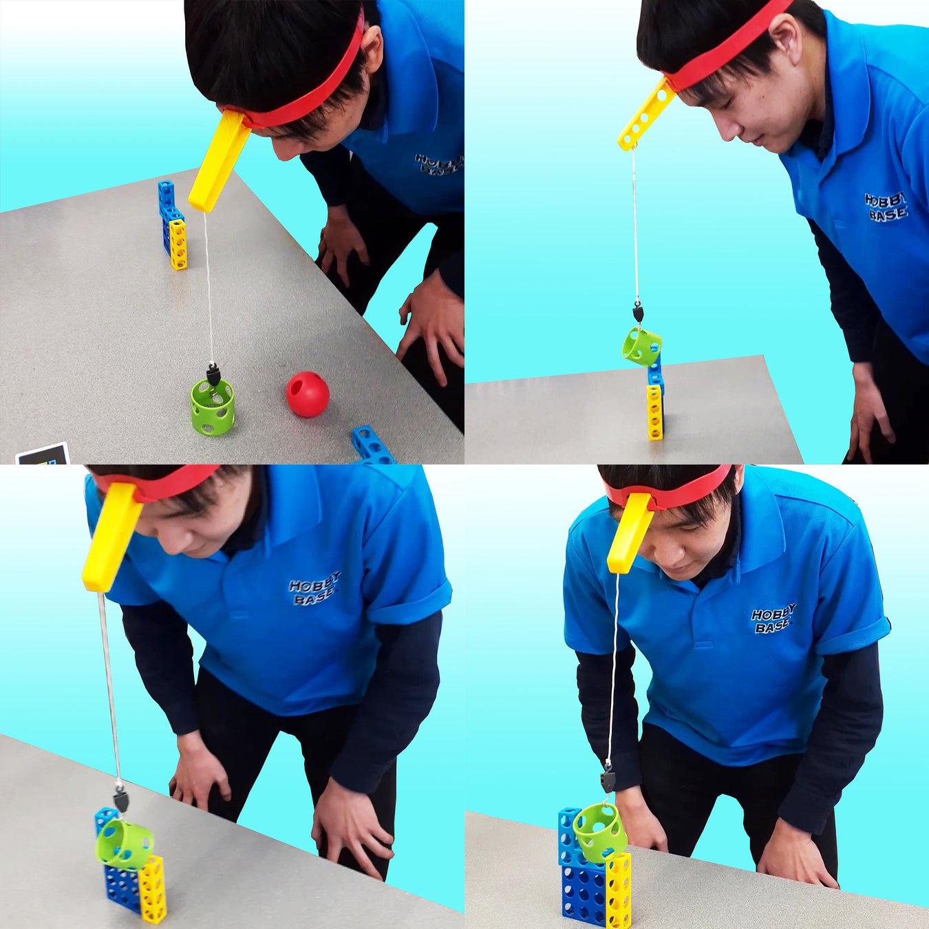 お題はどれも簡単そうに見えますが、手ではなく、頭につけたクレーンを使って積まなければなりません。