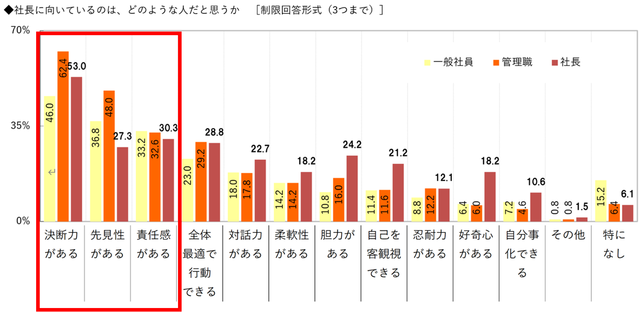 社長が思う「社長に向いている人の特徴」TOP3は「決断力がある」「責任感がある」「全体最適で行動できる」