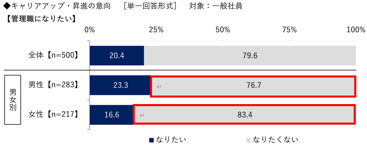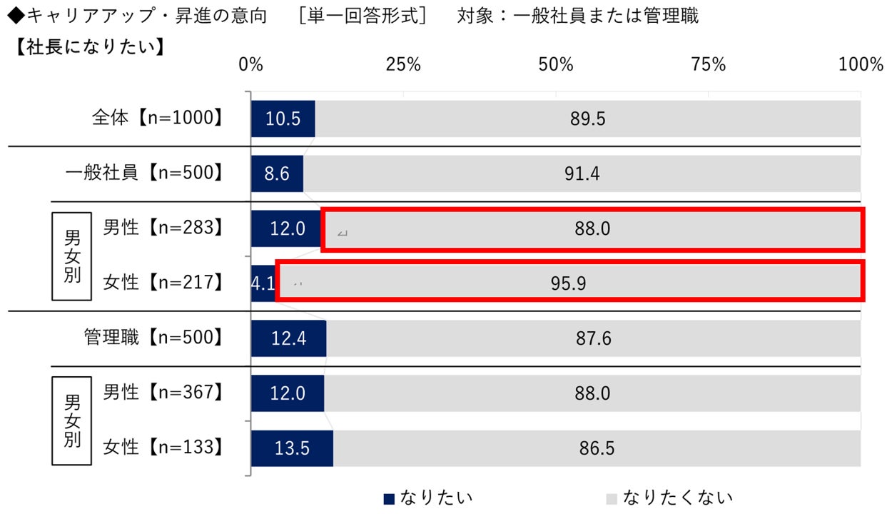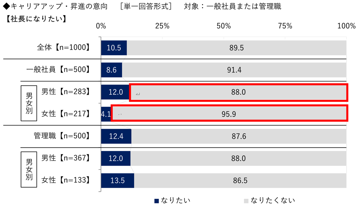 また、一般社員の回答を男女別で見ると、「管理職になりたくない」と回答した人は男性で76.7%、女性で83.4%、「社長になりたくない」と回答した人は、男性で88.0%、女性で95.9%という結果となりました。