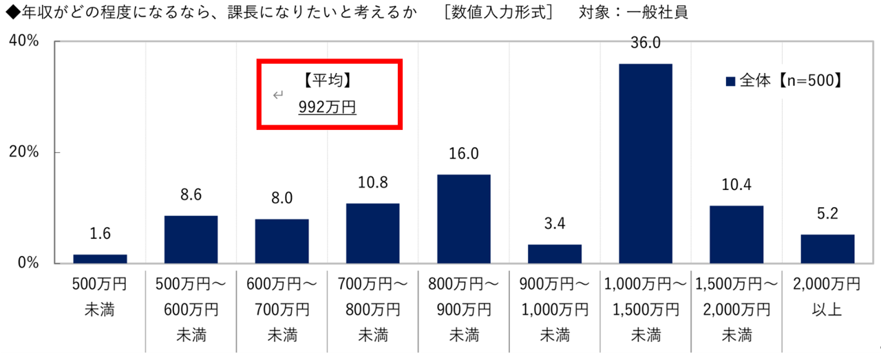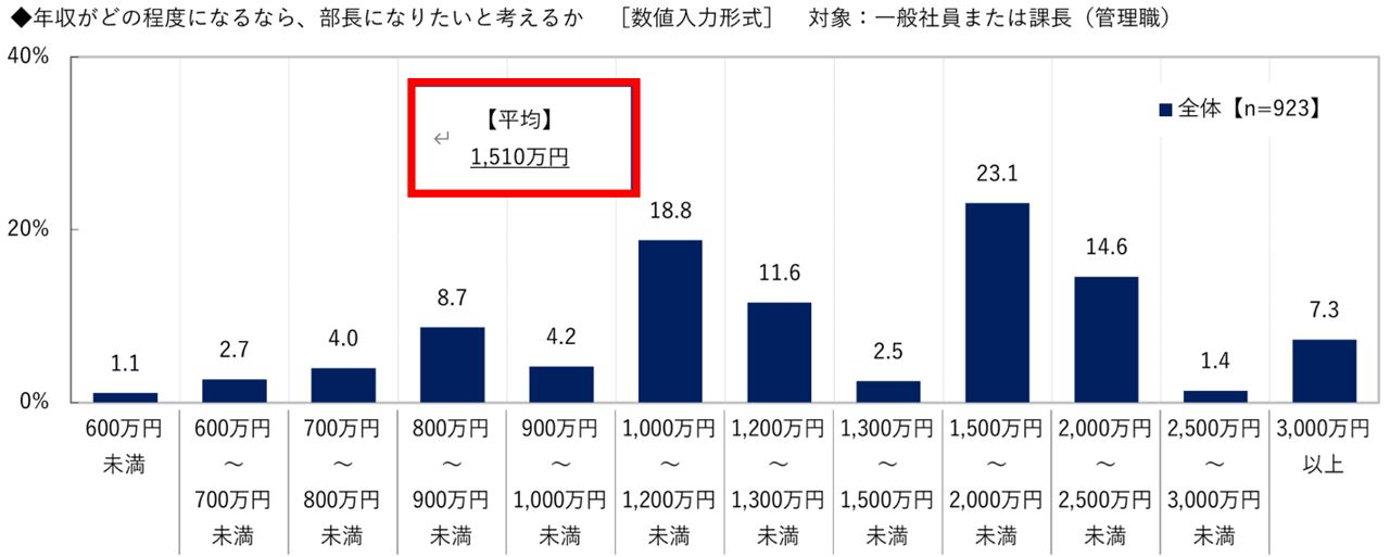 ■役職に就くとした場合の希望平均年収は、課長職「992万円」、 部長職「1,510万円」、社長職「4,200万」であることが明らかに
