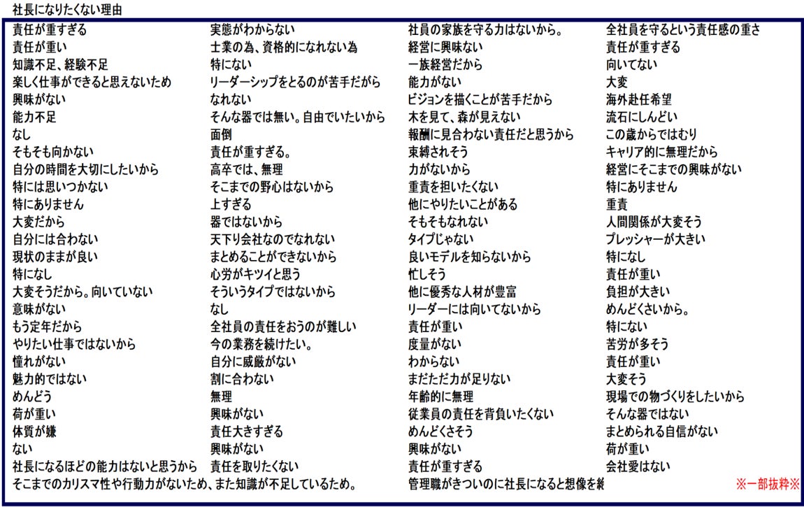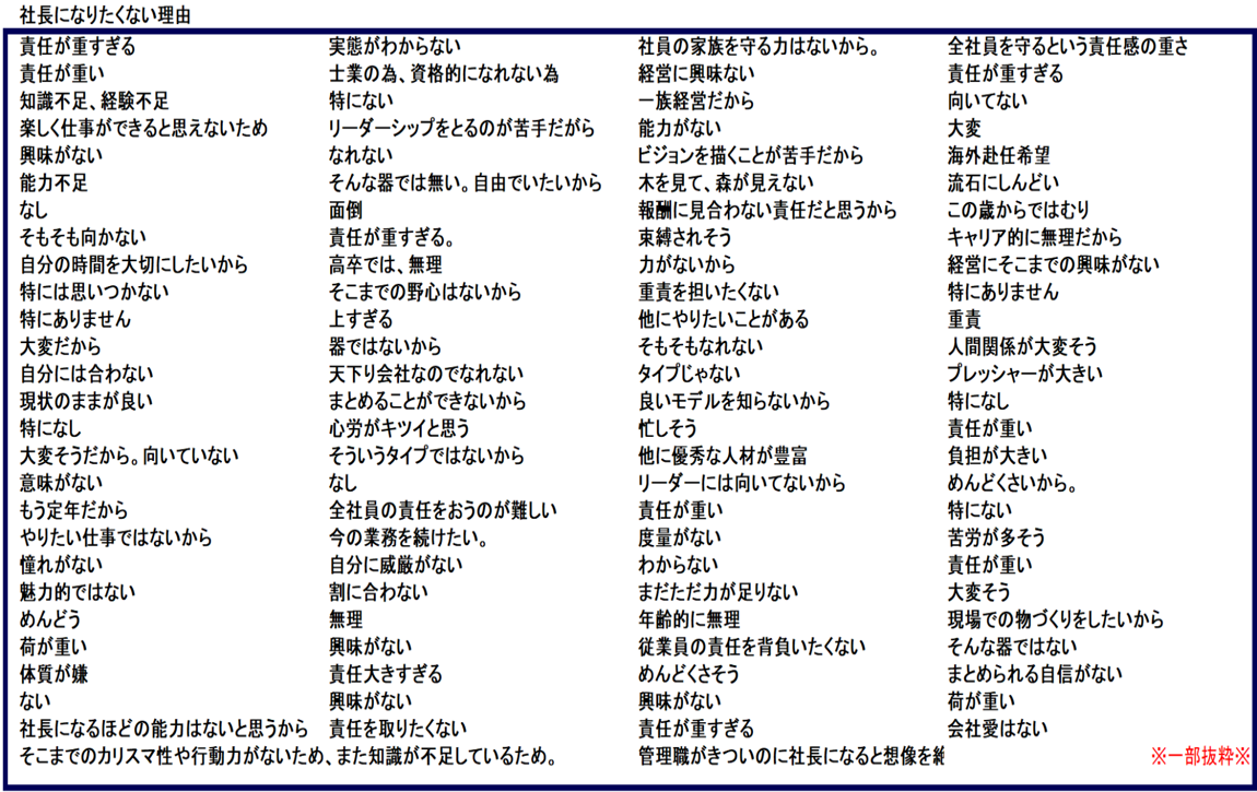 ・次期社長候補となり得る層(管理職)についても、社長を目指すことに前向きではないことが明らかに