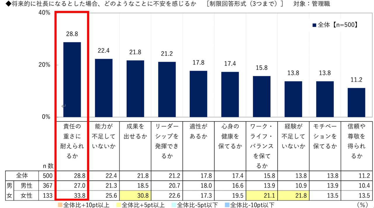 社長になるとした場合の不安要素 1位は男女ともに「責任の重さに耐えられるか」という結果となりました。