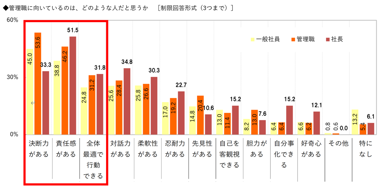 ・社長が評価する「管理職に向いている人」の1位は「責任感がある」、2位は「対話力がある」、3位は「決断力がある」、一方で社長が評価する「社長に向いている人」の1位は「決断力がある」、2位は「責任感がある」、3位は「全体最適で行動できる」
