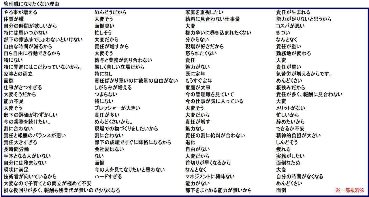 ・「管理職になりたくない理由」には「社長同様に「責任が重い」というのがありつつも、「仕事量に(給与が)見合わない」「板挟み」などの回答も目立った